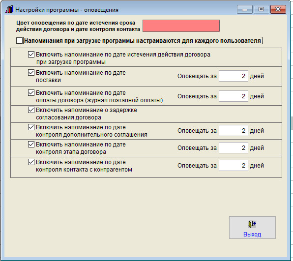 Если Вы хотите, чтобы оповещения настраивались для каждого пользователя, установите галочку "Напоминания при загрузке программы настраиваются для каждого пользователя".