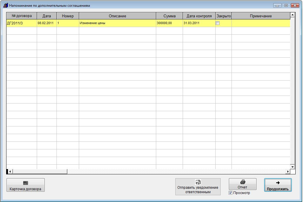 В оповещение попадут дополнительные соглашения, для которых текущая дата станет больше либо равна Дате контроля минус количество дней, за которое надо оповещать, и не будет установлена галочка "Закрыто".