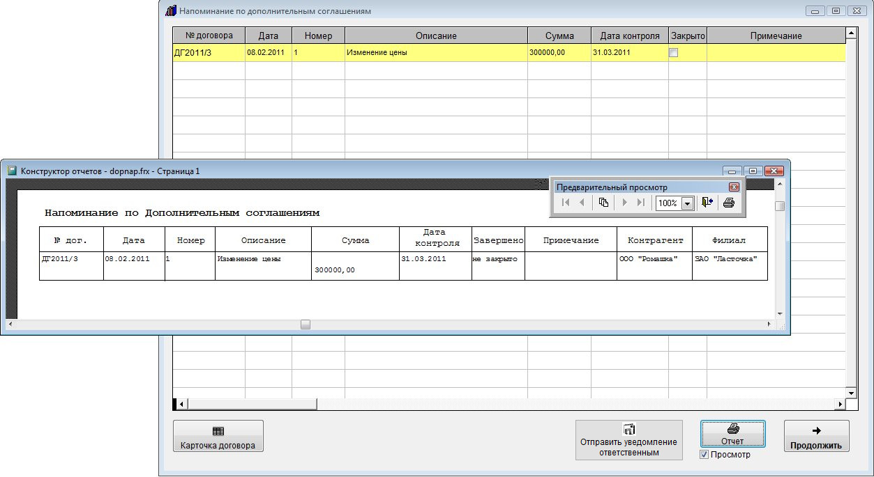 В программе "Ведение договоров" можно организовать оповещение по дате контроля дополнительных соглашений при загрузке программы.