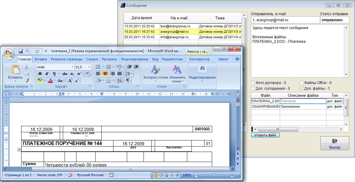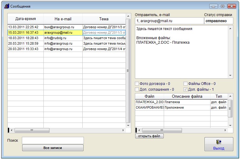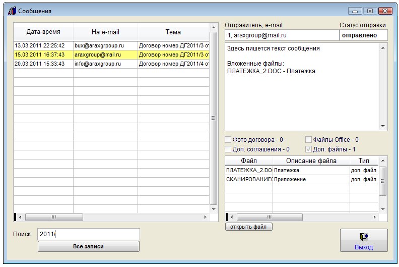 Для просмотра всех сообщений, отправленных из программы на конкретный e-mail выберите пункт меню "Сервис-Просмотр всех сообщений на e-mail" в режиме Администратора.