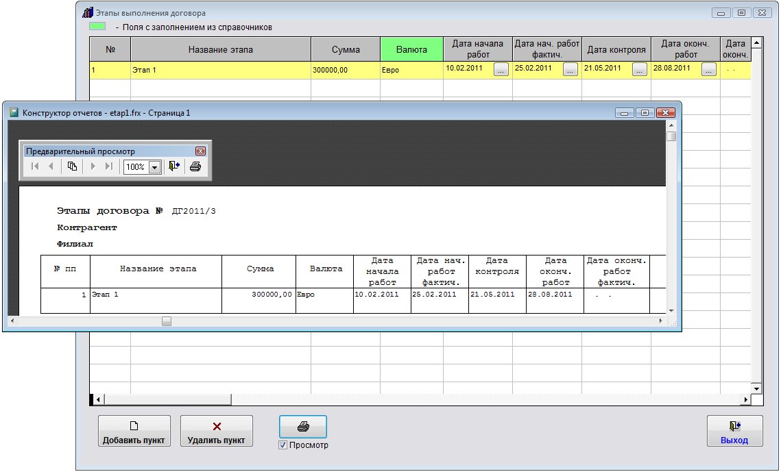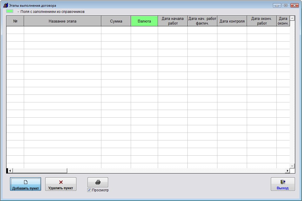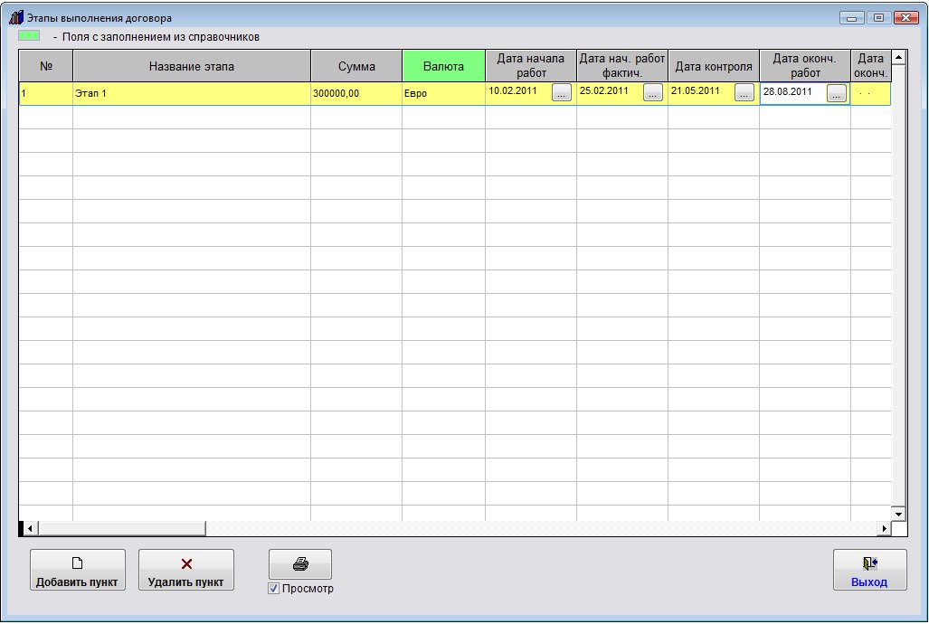 Для внесения этапов по договору нажмите кнопку Этапы (в группе кнопок в правой части формы карточки договора либо журнала договоров).