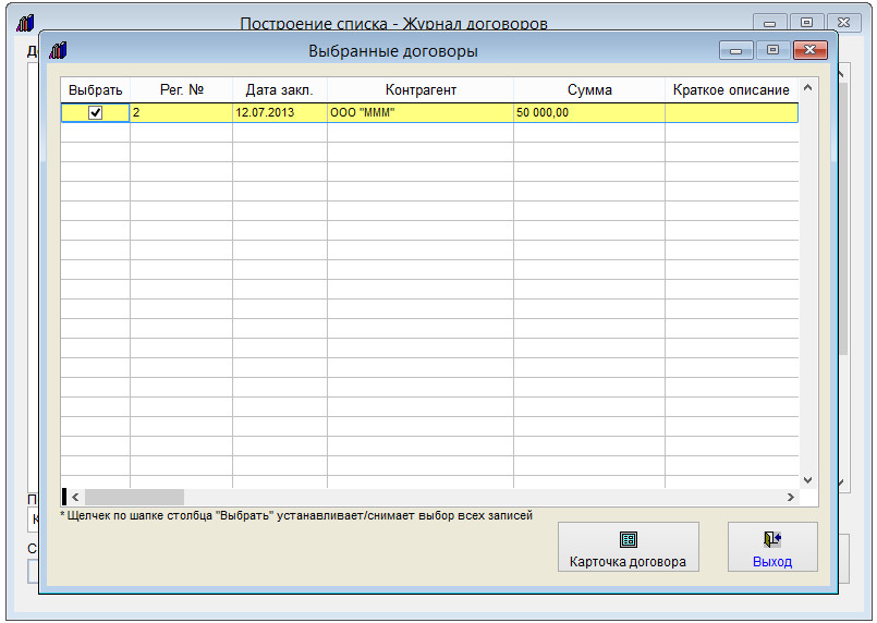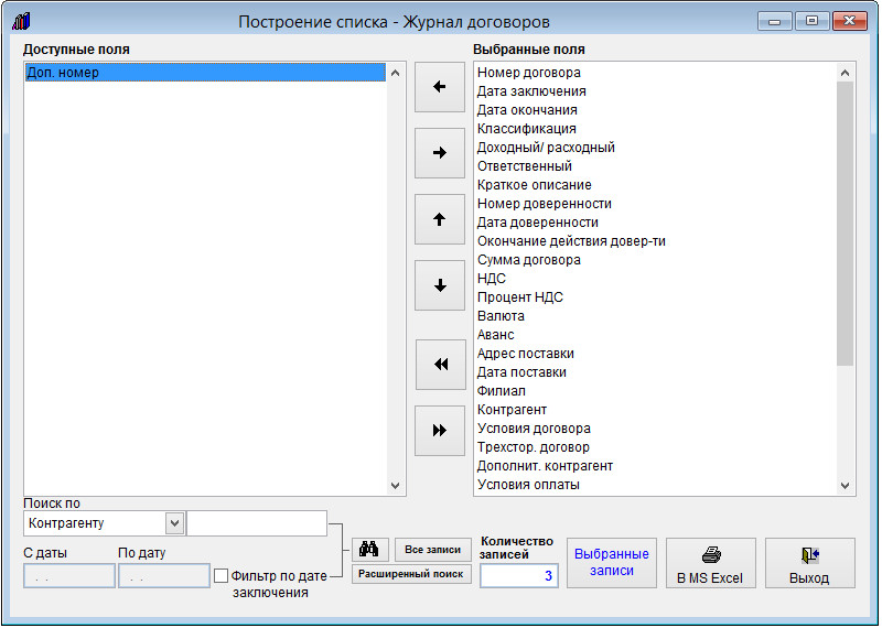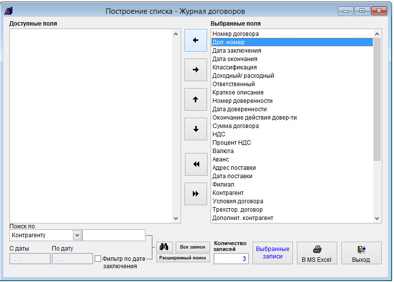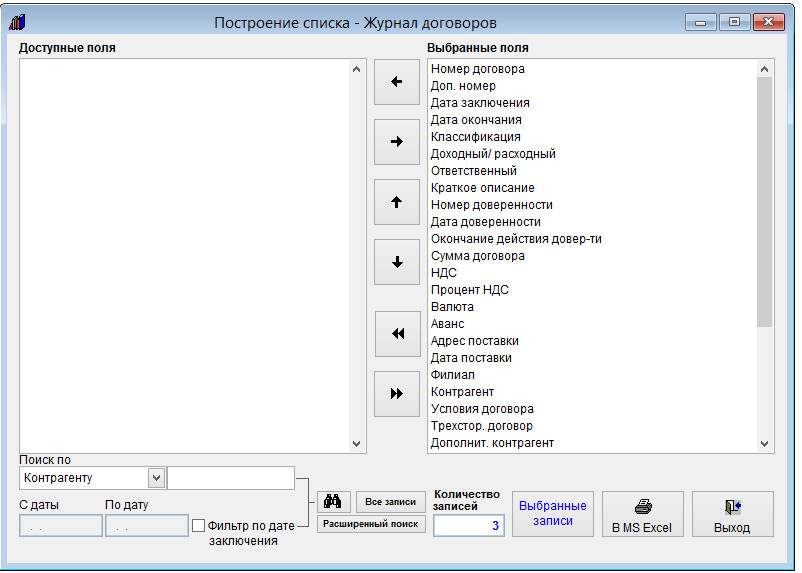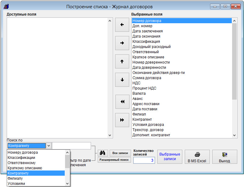 В окне настройки выберите те поля карточки договора, которые требуется экспортировать в MS Excel (OO Calc).