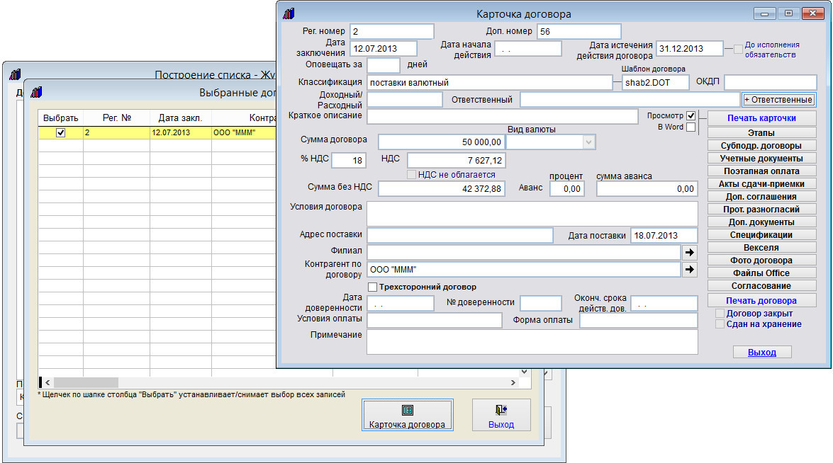 Также из данного раздела можно просмотреть карточку договора, нажав на кнопку "Карточка договора".