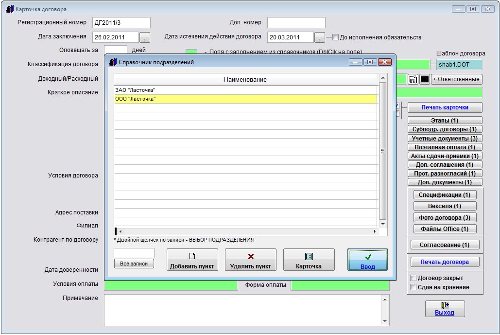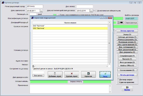 Филиал можно добавить непосредственно при заполнении карточки договора (поля Филиал).