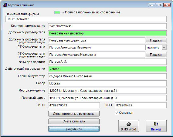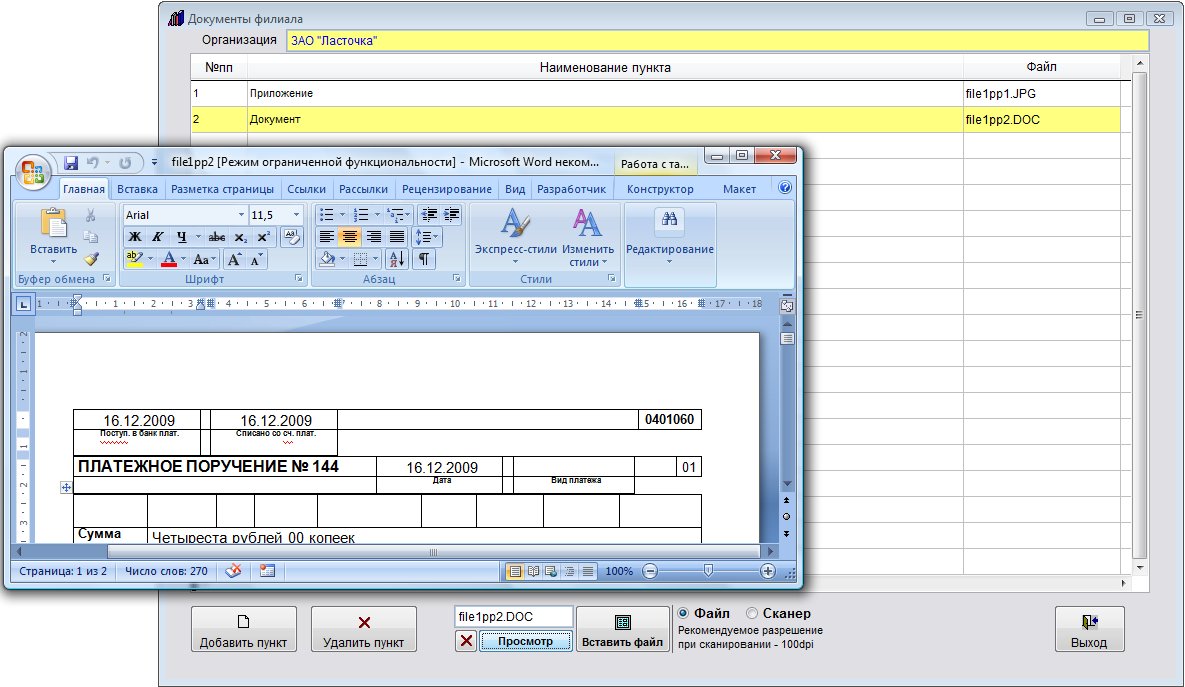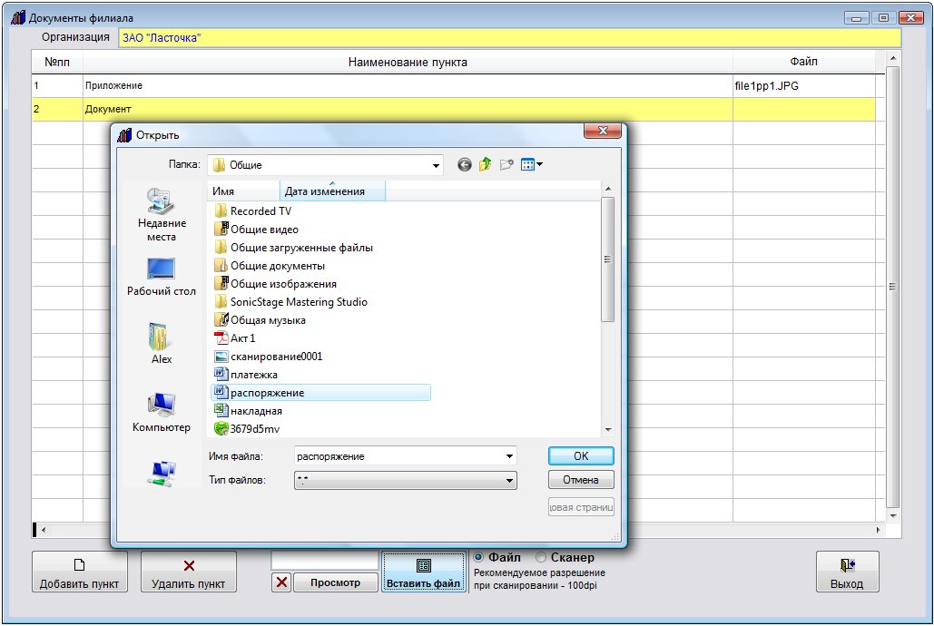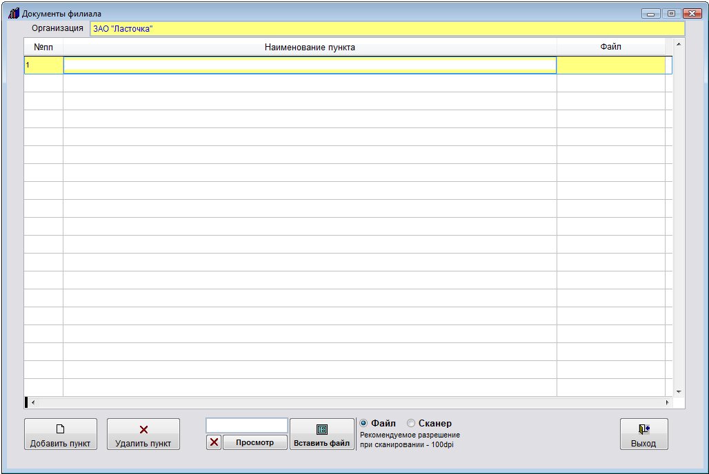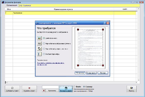 Для прикрепления к карточке филиала отсканированных документов выберите пункт меню "Справочники-Филиалы".