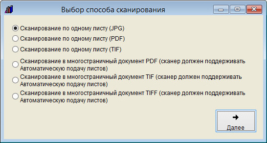 Затем выберите, в каком формате Вы хотите сканировать документ (в формате JPG, TIF, PDF или, если Ваш сканер поддерживает автоматическую подачу листов, в многостраничный PDF, TIF или TIFF) и нажмите Далее.