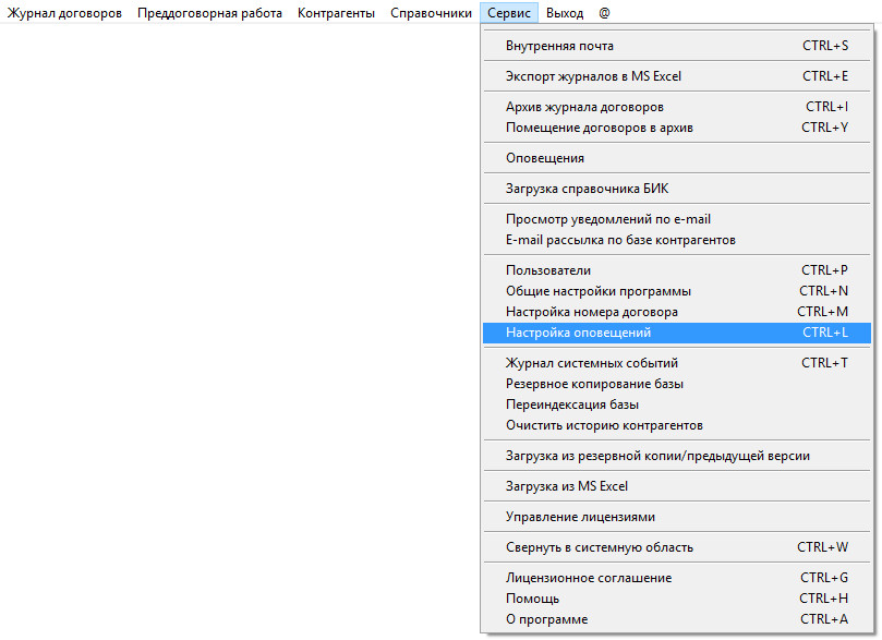 Для настройки оповещения по контактам выберите пункт меню Сервис-Настройка оповещений.