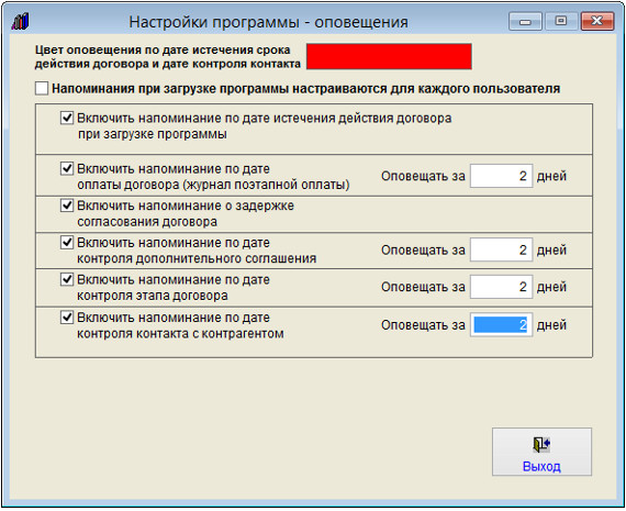 При включенной галочке "Напоминания при загрузке программы настраиваются для каждого пользователя" включить/отключить напоминание по контактам и установить количество дней можно в разделе Сервис-Пользователи.