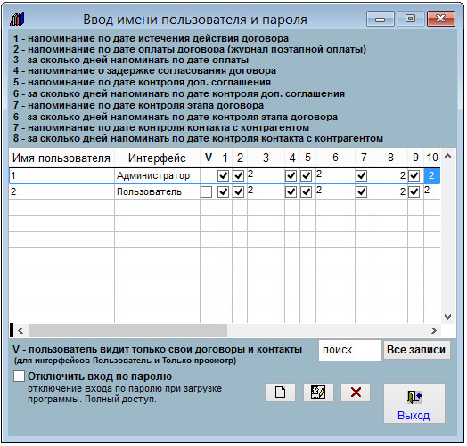 В столбце 7 включается/отключается напоминание по контактам для каждого пользователя.