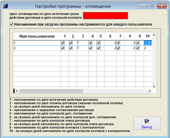 Включить/отключить напоминания можно для каждого пользователя программы.