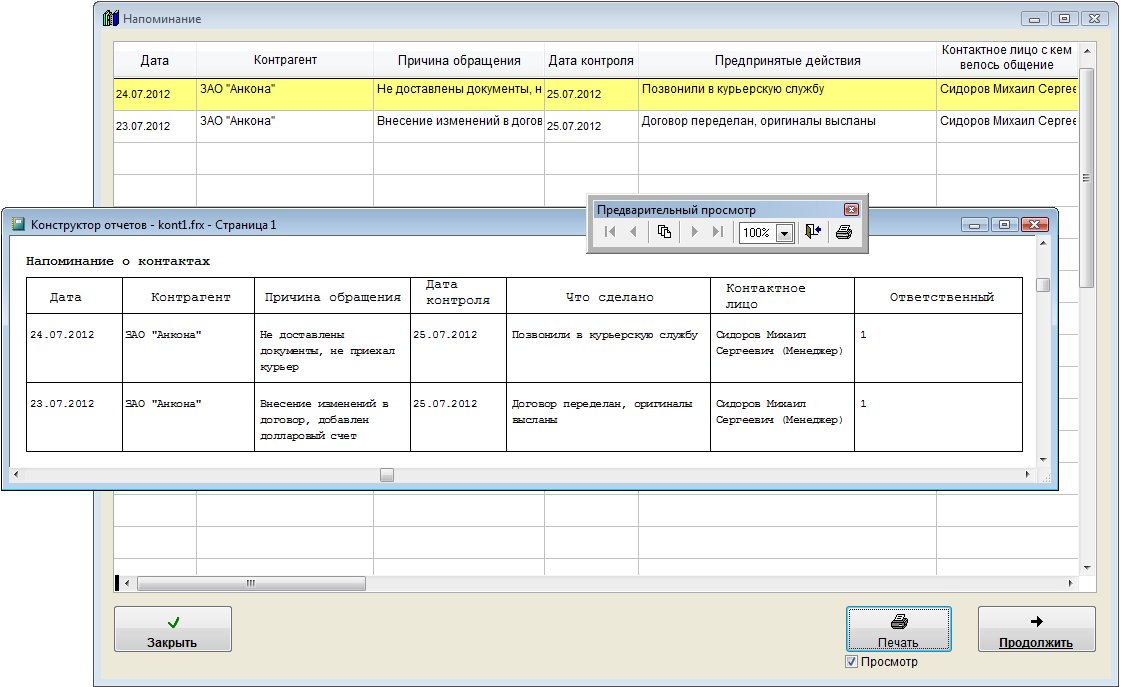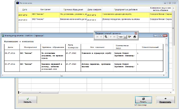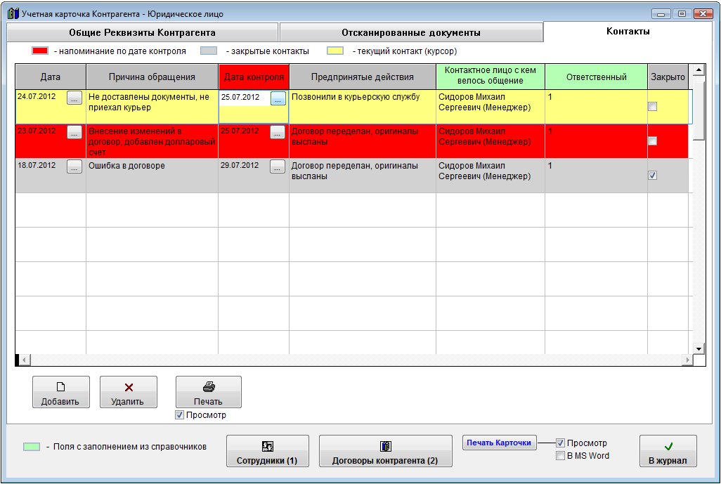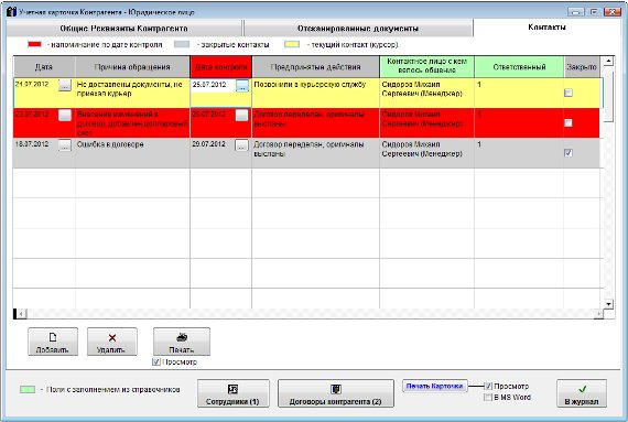 Контакты, у которых до даты контроля осталось менее, чем количество дней, указанное в настройках в меню Сервис-Настройка оповещений в разделе "Напоминание по контактам с контрагентами", выделяются красным цветом.