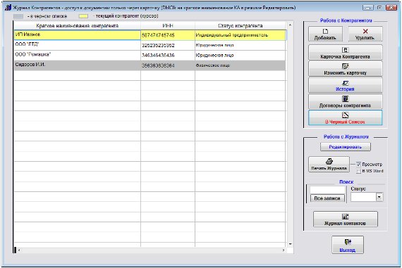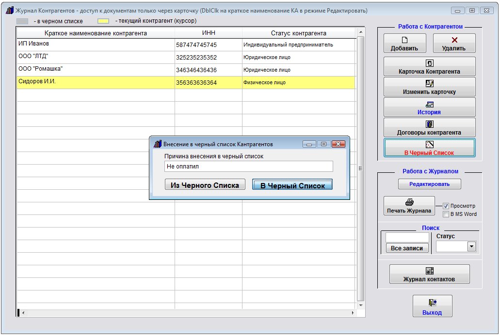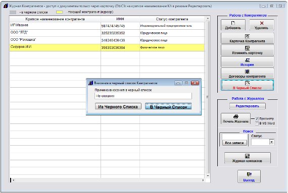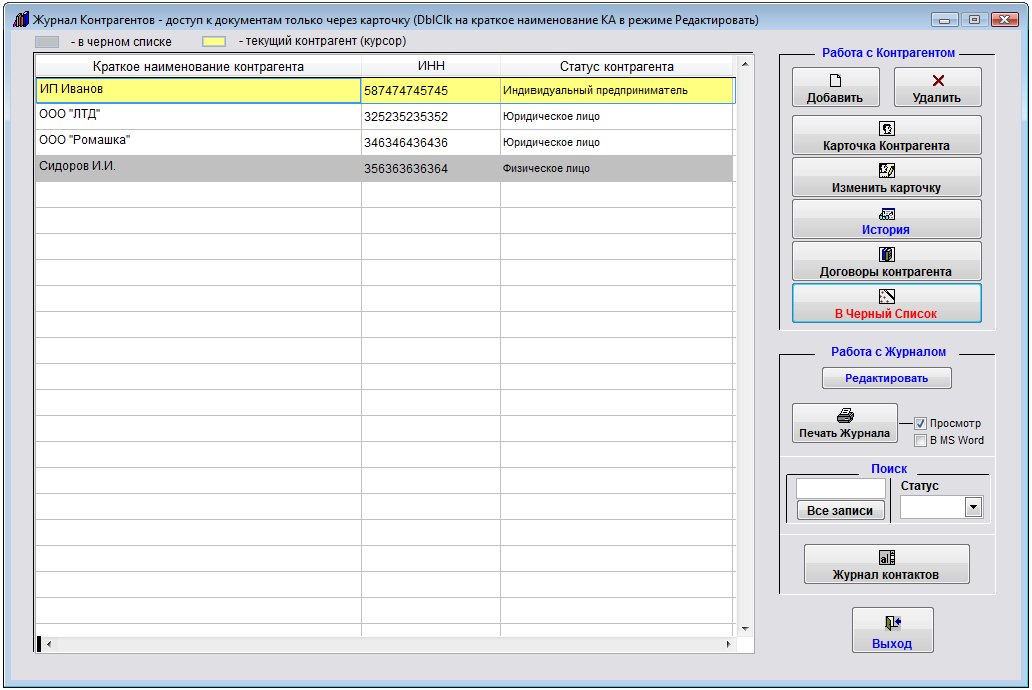 Контрагент, находящийся в черном списке в журнале будет выделен серым цветом.
