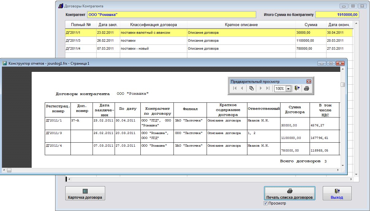 Для печати списка договоров данного контрагента нажмите кнопку "Печать" с изображением принтера.