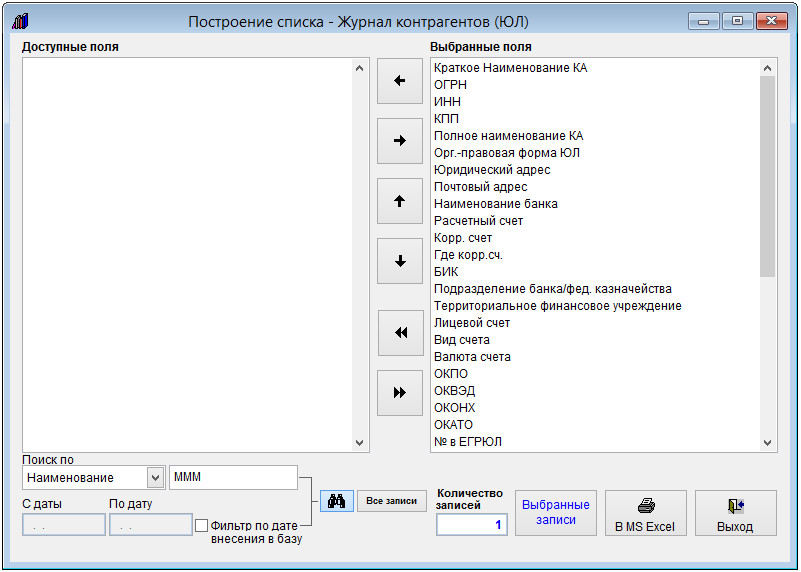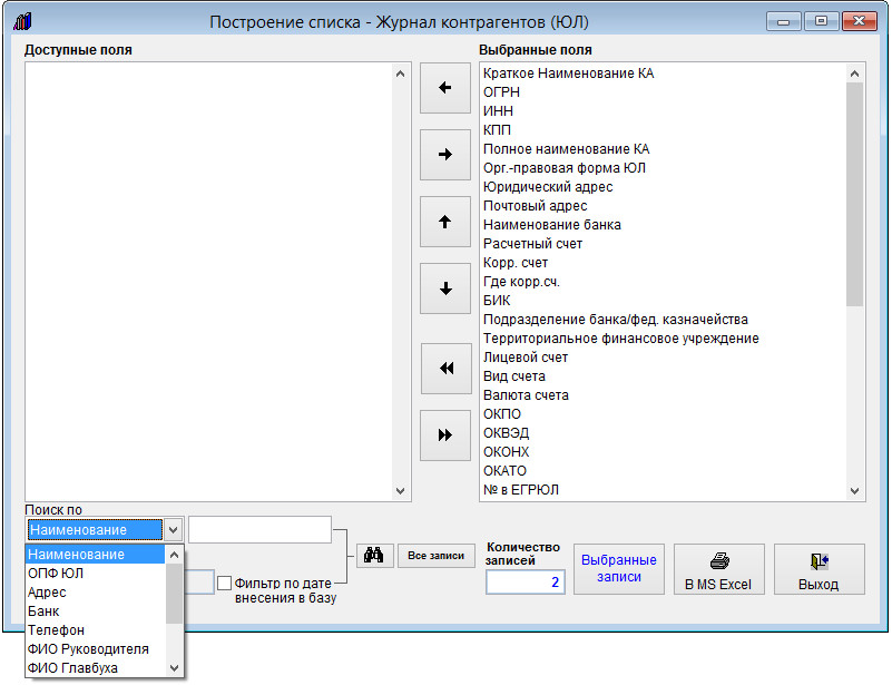 В окне настройки выберите те поля карточки контрагента, которые требуется экспортировать в MS Excel (OO Calc).