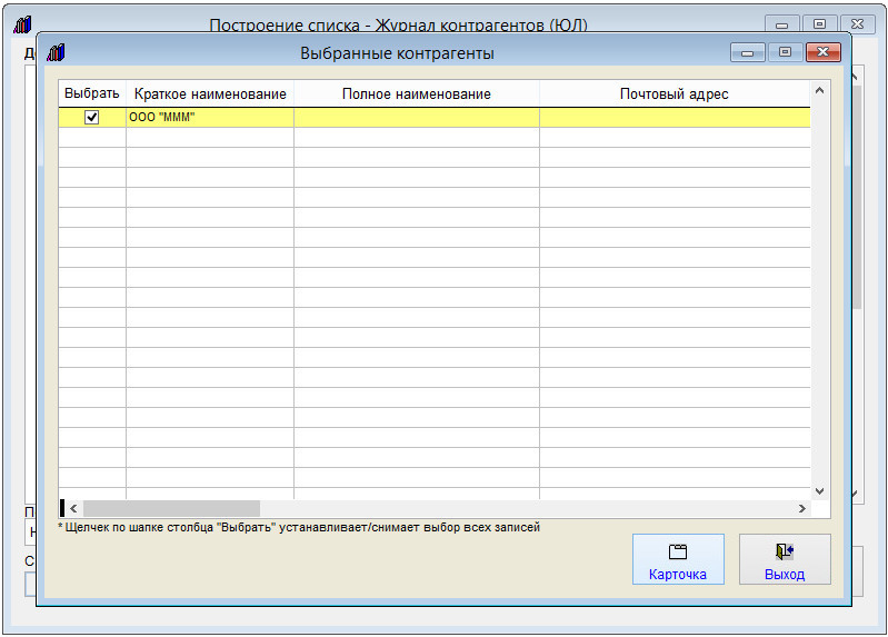 Нажав на кнопку "Карточка" можно посмотреть карточку каждого контрагента.