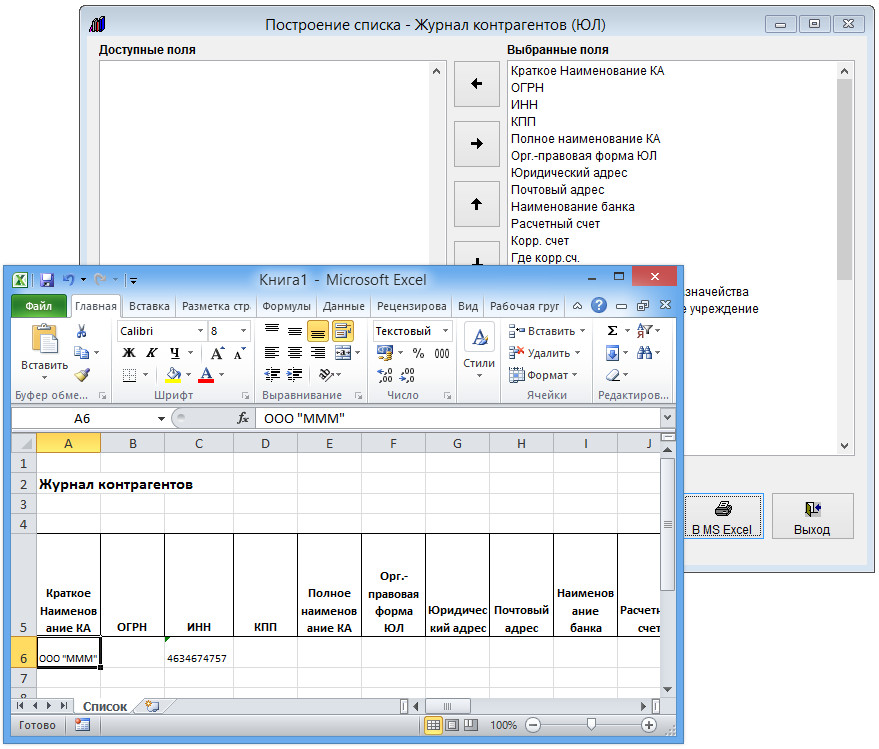 Для экспорта журнала контрагентов в Microsoft Excel, либо, при соответствующей
