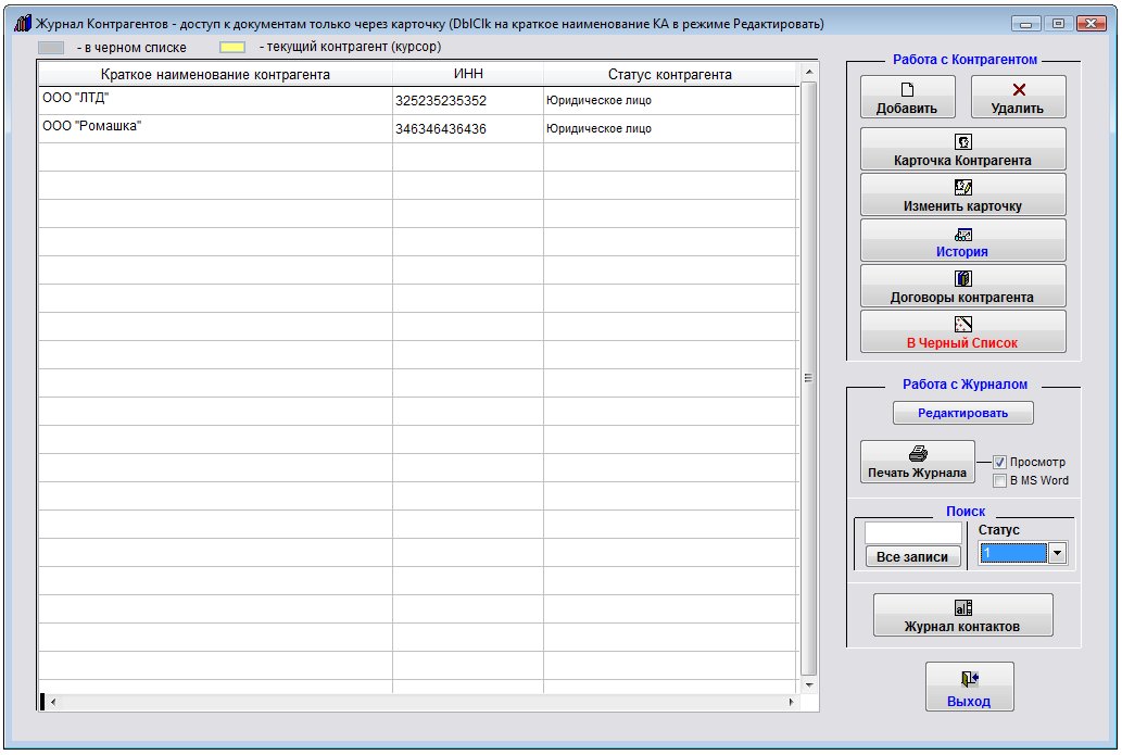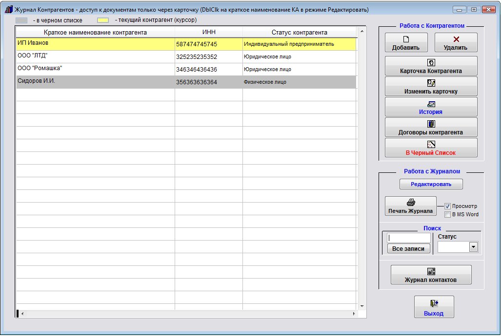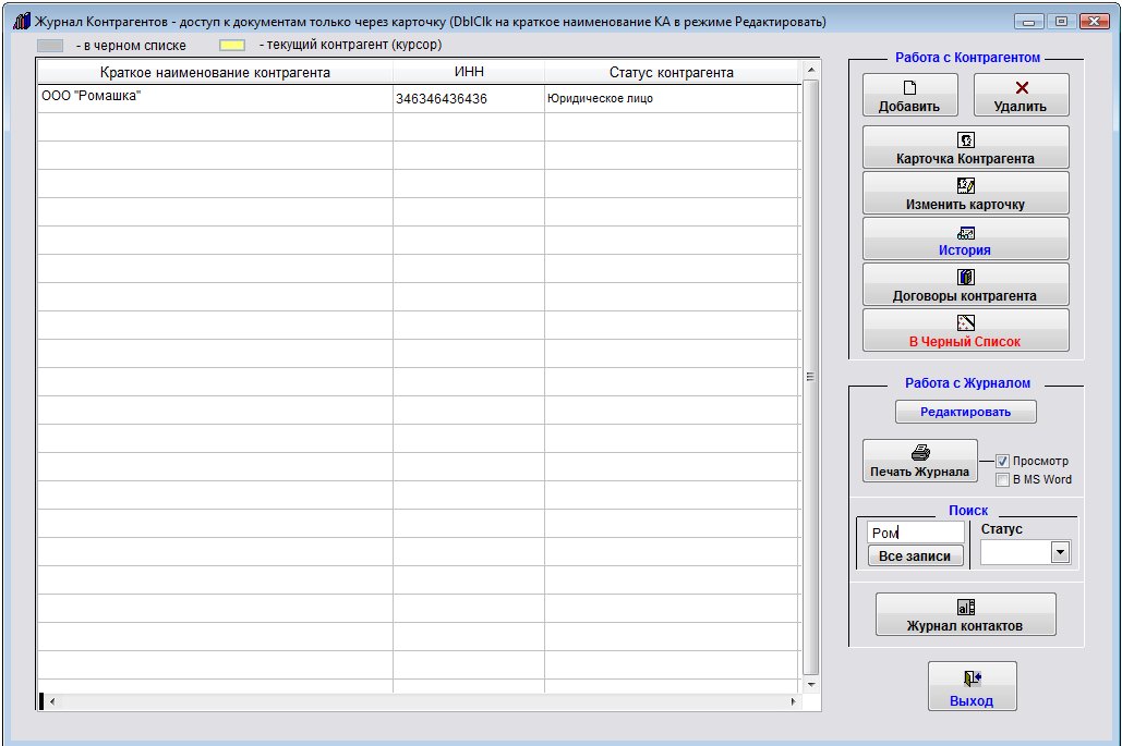 В журнале отобразятся контрагенты, в названии либо ИНН которых содержится введенный критерий поиска.