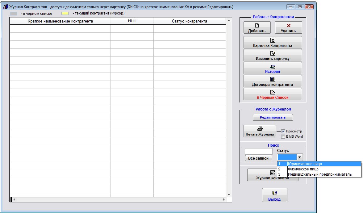 Для фильтра по статусу в группе поиска в правой части формы выберите из ниспадающего окна статус контрагентов - Юридическое лицо, Физическое лицо или Индивидуальный предприниматель.