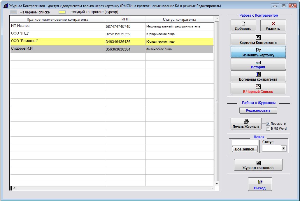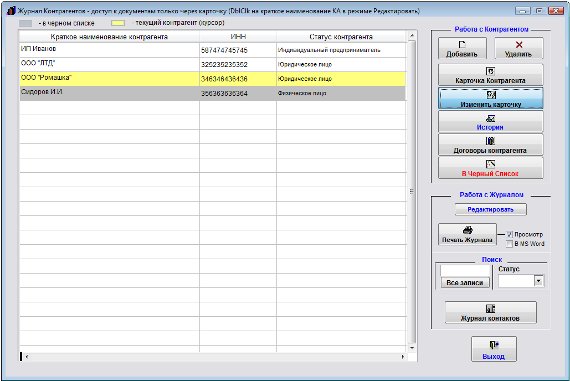 Для изменения нужного контрагента мышью установите на него курсор (контрагент выделится желтым) и нажмите кнопку "Изменить карточку КА" в правой верхней части формы.