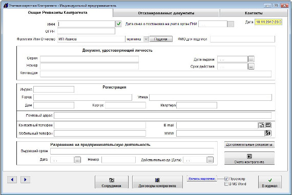 Заполните карточку контрагента - ИП. Заполнение карточки контрагента ИП аналогично заполнению карточки для юридического лица.
