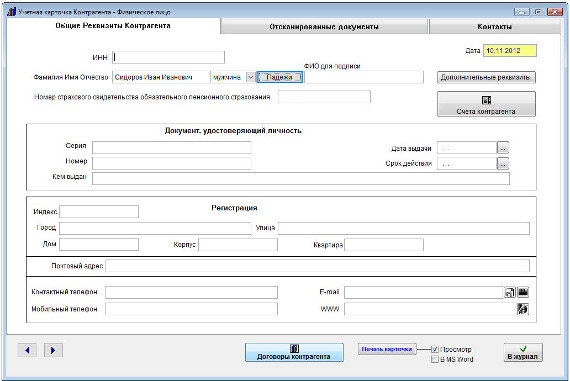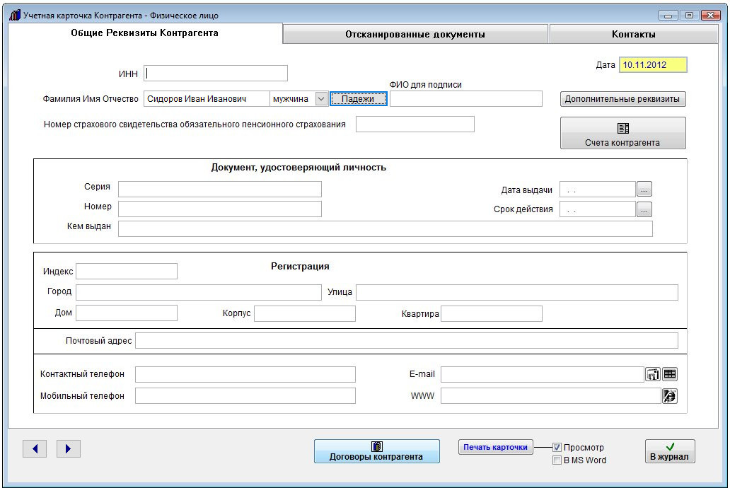 Заполните карточку контрагента физического лица. Заполнение карточки контрагента физлица аналогично заполнению карточки для юридического лица.