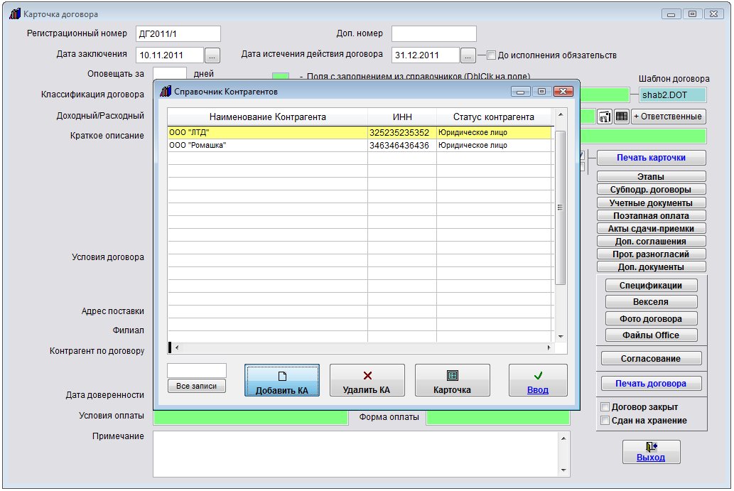 Контрагента можно добавить непосредственно при заполнении карточки договора (поля Контрагент).