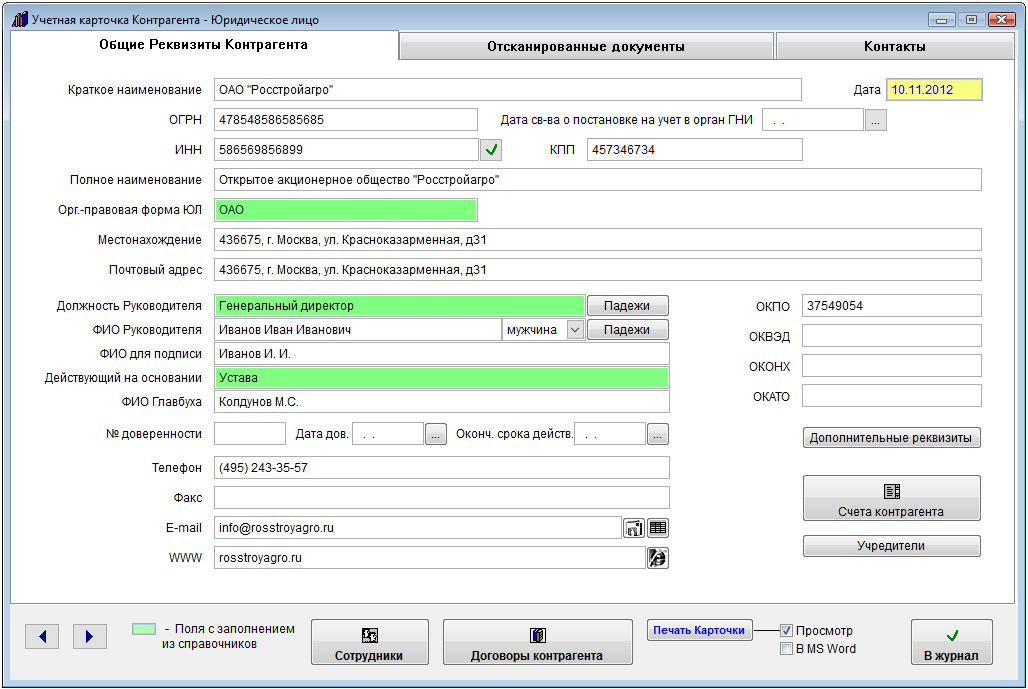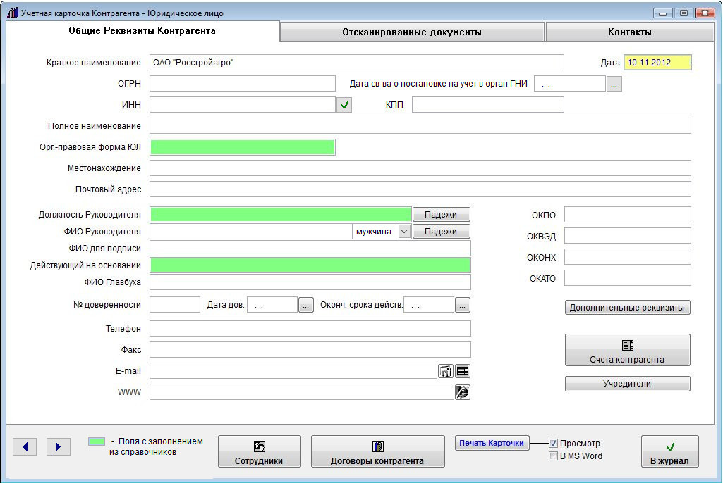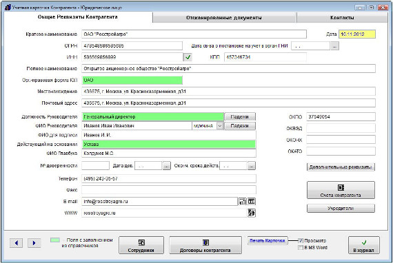 В случае юридического лица откроется форма "Учетная карточка контрагента - Юридическое лицо".
