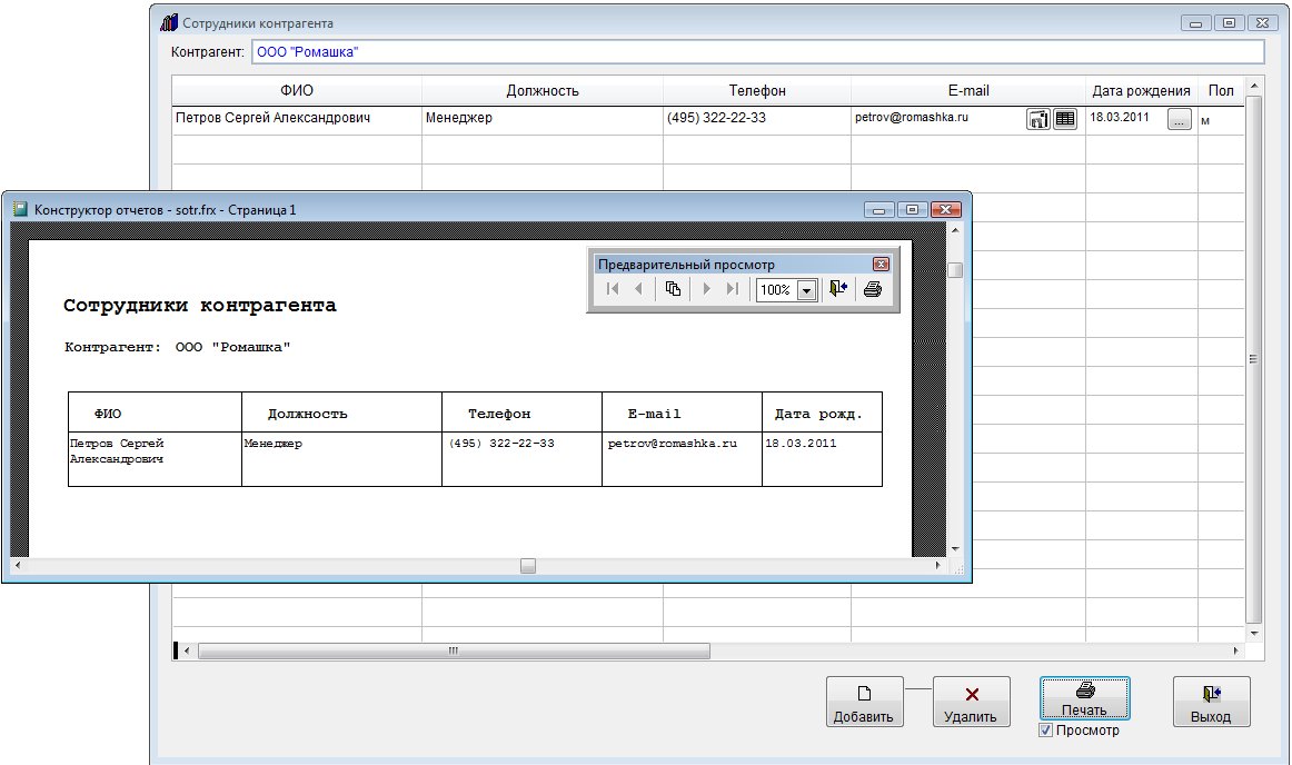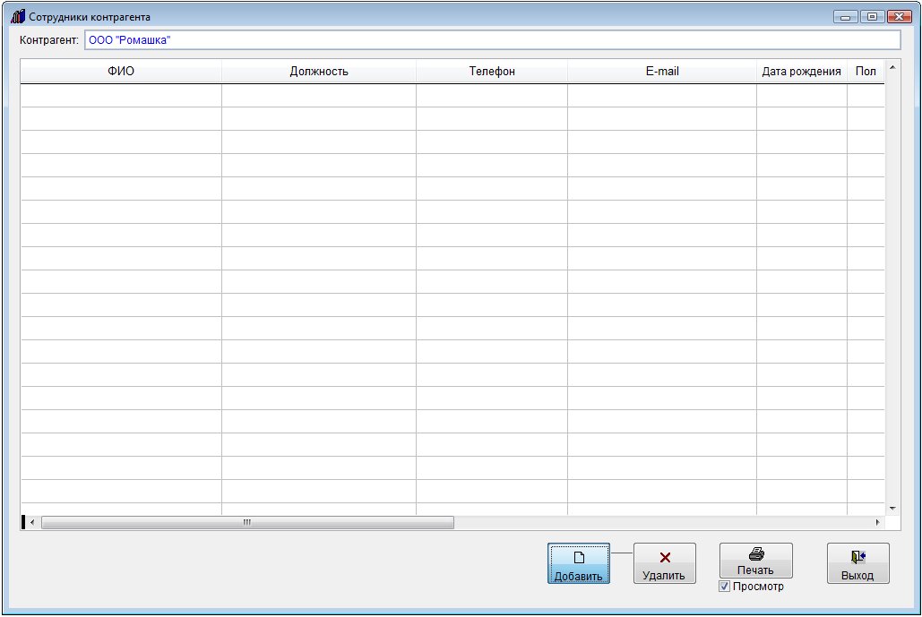 Для печати списка сотрудников данного контрагента нажмите кнопку "Печать" с изображением принтера.