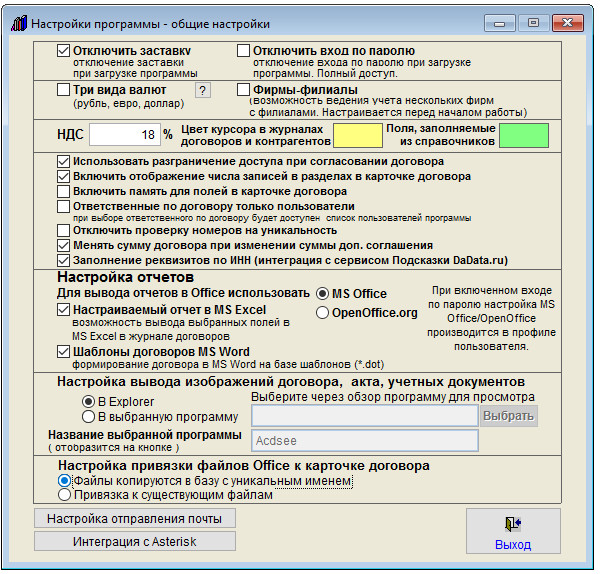 Для настройки места хранения файлов Word и Excel из раздела Файлы Office в карточках договоров выберите пункт меню "Сервис - Общие настройки программы".