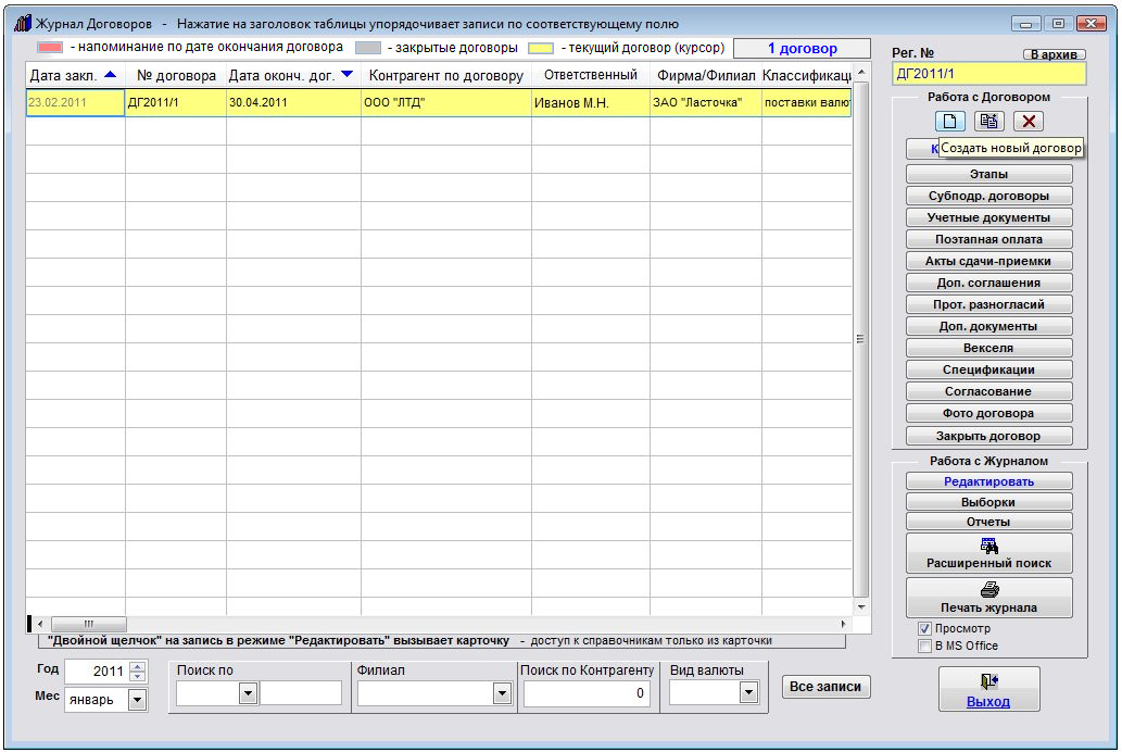 Для добавления нового договора в журнал нажмите кнопку "Создать новый договор" с изображением чистого листка в правом верхнем углу формы журнала договоров.