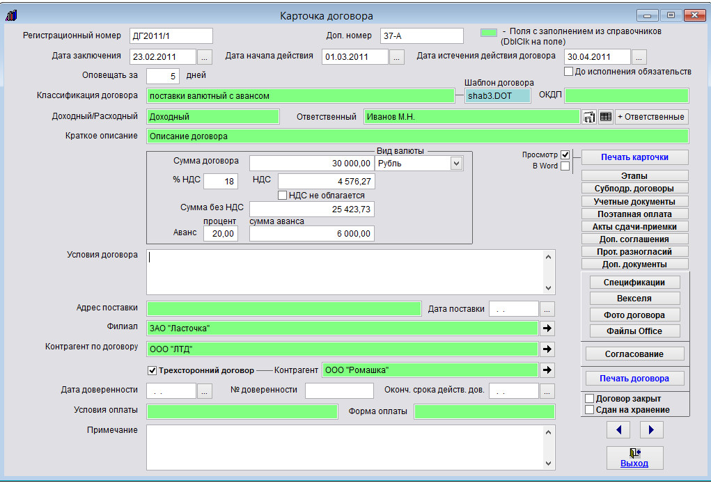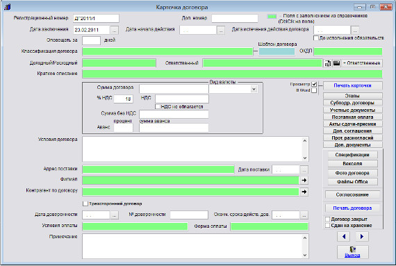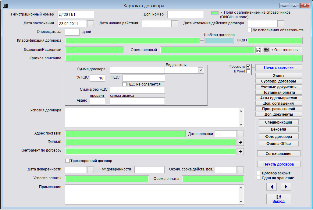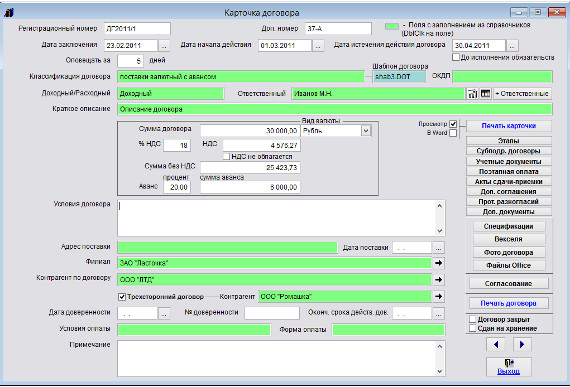 Заполните нужные поля в карточке договора.