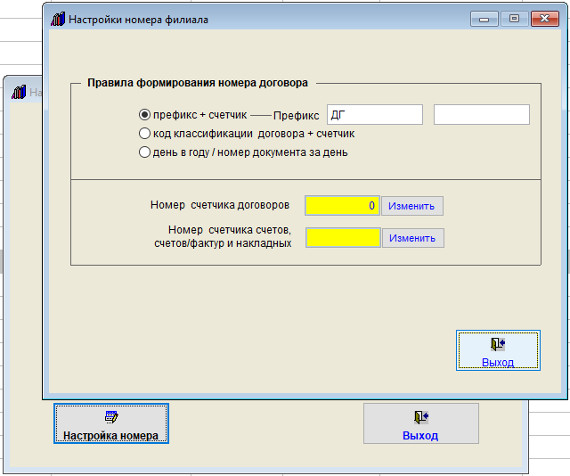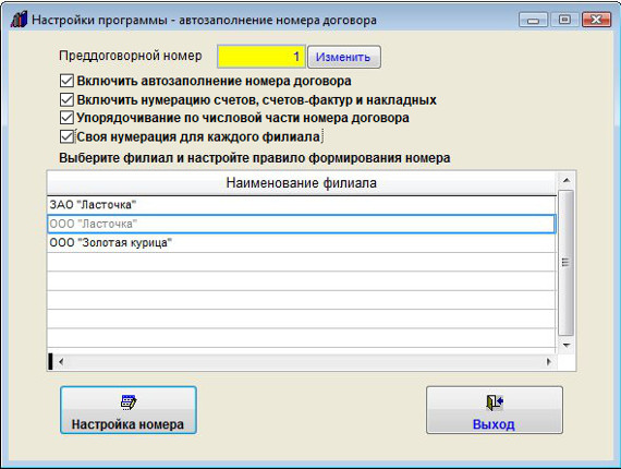 В данном окне можно включить/отключить автоматическое заполнение номера договора установив/сняв соответствующую галочку.