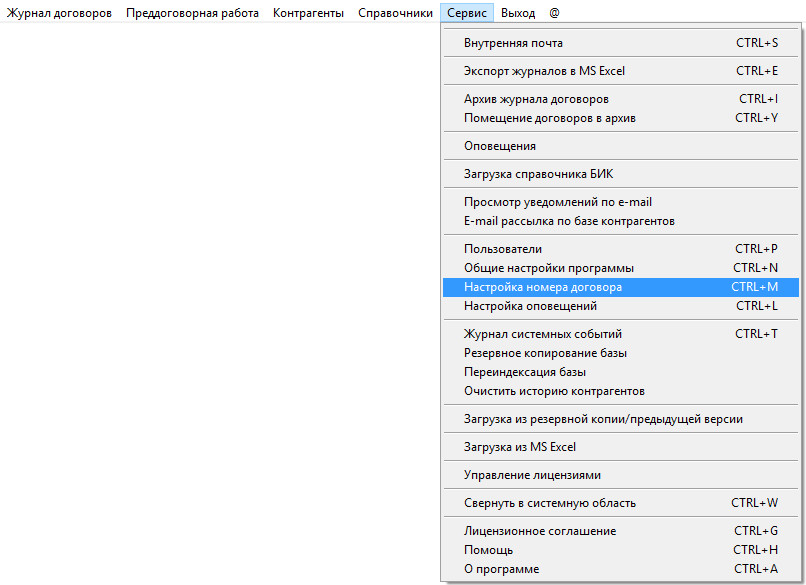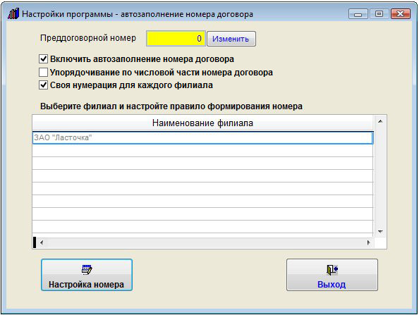 Для настройки номера договора выберите пункт меню "Сервис-Настройка номера договора".