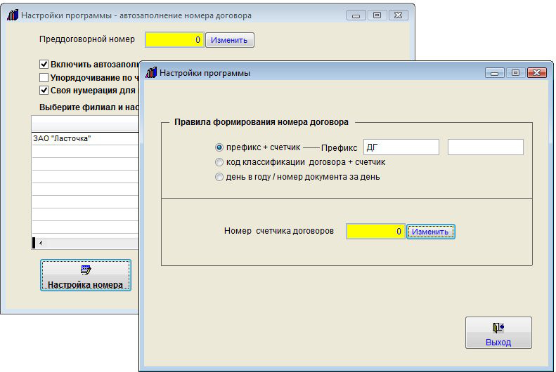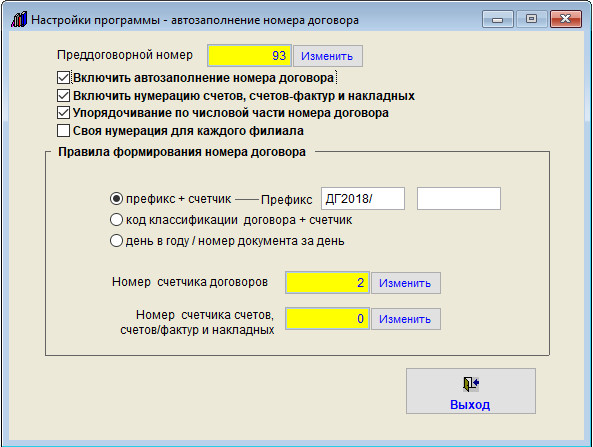 в поле "Номер счетчика договоров" поставьте номер, с следующего за которым должна пойти нумерация договоров для данного филиала (перед созданием карточки договора будет предложено выбрать филиал), префиксы измените на нужные, в конце нажмите кнопку "Выход".