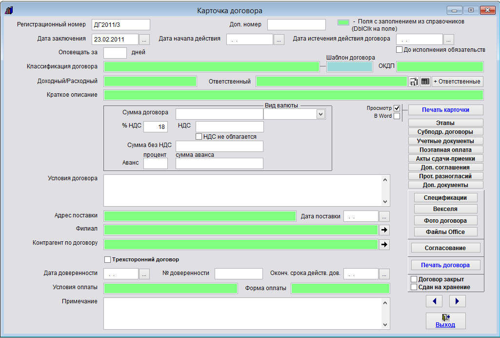 В результате новые карточки в журнале договоров начнут формироваться с новыми префиксами с номера, следующего за установленным значением счетчика.