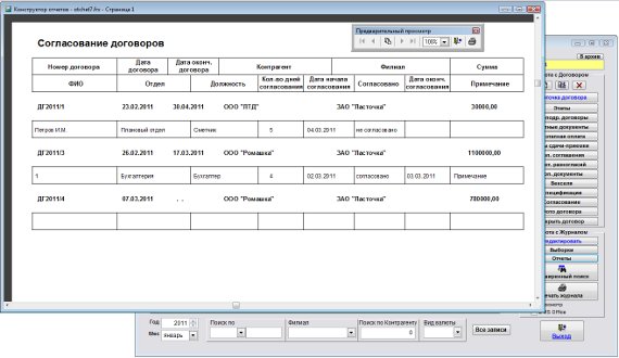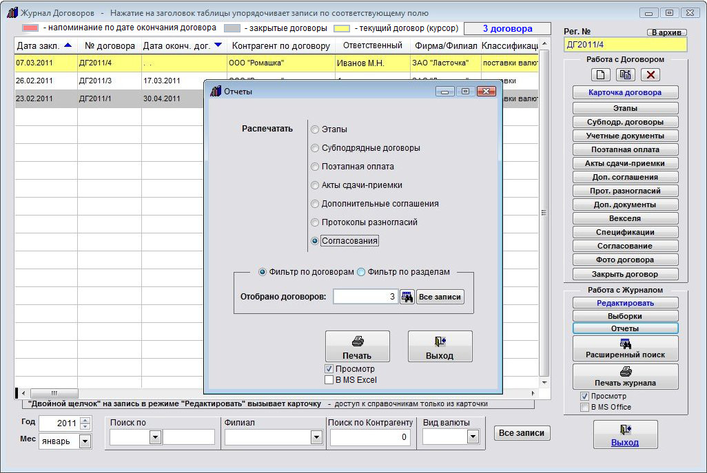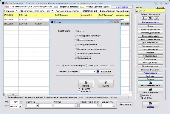 Для печати отчетов по договорам нажмите кнопку "Отчеты" в правой нижней части формы журнала договоров в группе кнопок "Работа с журналом".