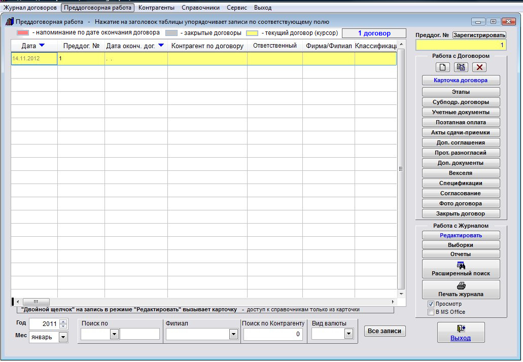 Как присвоить номер договору, находящемуся в преддоговорной работе и переместить его в журнал договоров