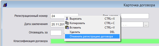 Если нужно вернуть договор в журнал преддоговорной работы, откройте карточку этого договора, нажмите правой кнопкой мыши на поле "Регистрационный номер" и в контекстном меню выберите пункт "Отменить регистрацию договора".