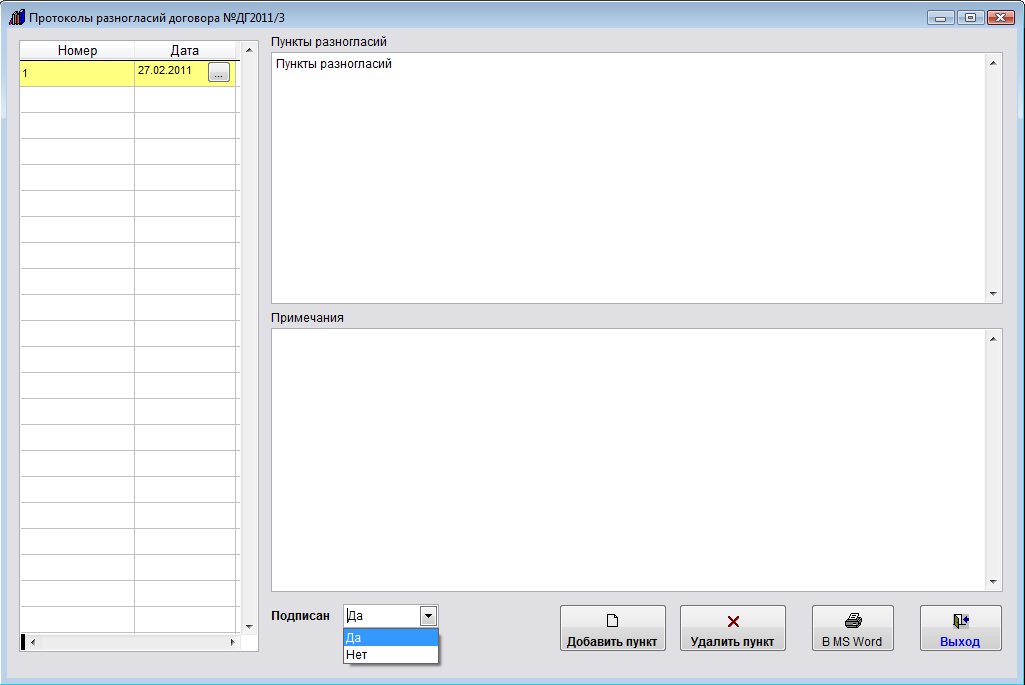 Заполните нужные параметры протокола разногласий - номер, дату, пункты разногласий.
