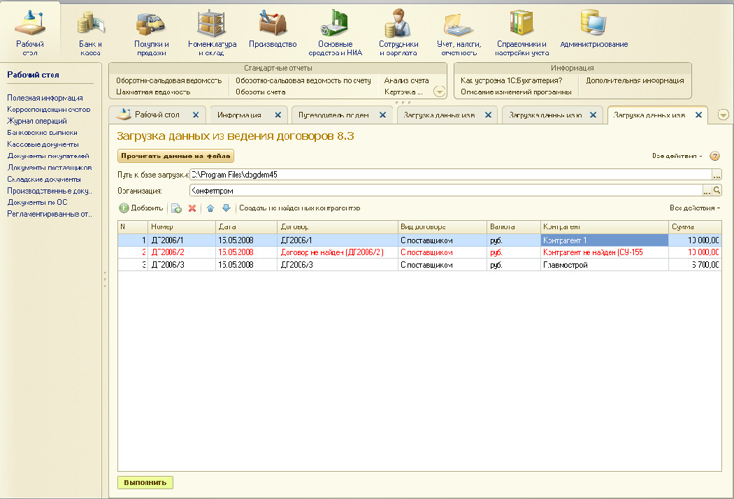 Порядок работы. 1.Запустить обработку в информационной базе 1С Предприятие 8.3 2. Выбрать путь к каталогу базы «Ведение договоров 6.0» 3. Прочитать данные из базы • Откорректировать загруженные данные • Строки с ненайденными в базе 1С договорами и контрагентами выделены красным • Создать не найденных контрагентов в базе 1С • Если в программе «Ведение договоров 6.0» нет у контрагента ИНН то он автоматически не будет загружен в 1С Предприятие 8.3 • Нажать кнопку выполнить для загрузки договоров в 1С Предприятие 8.3