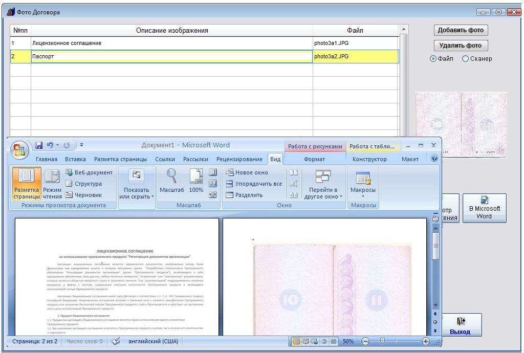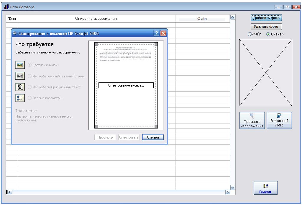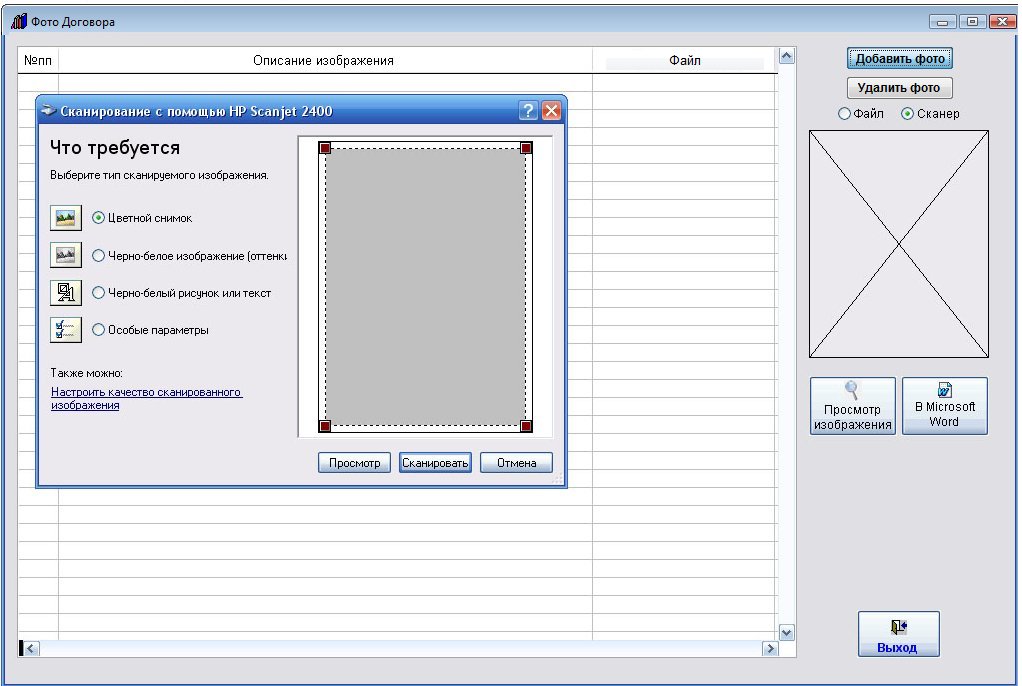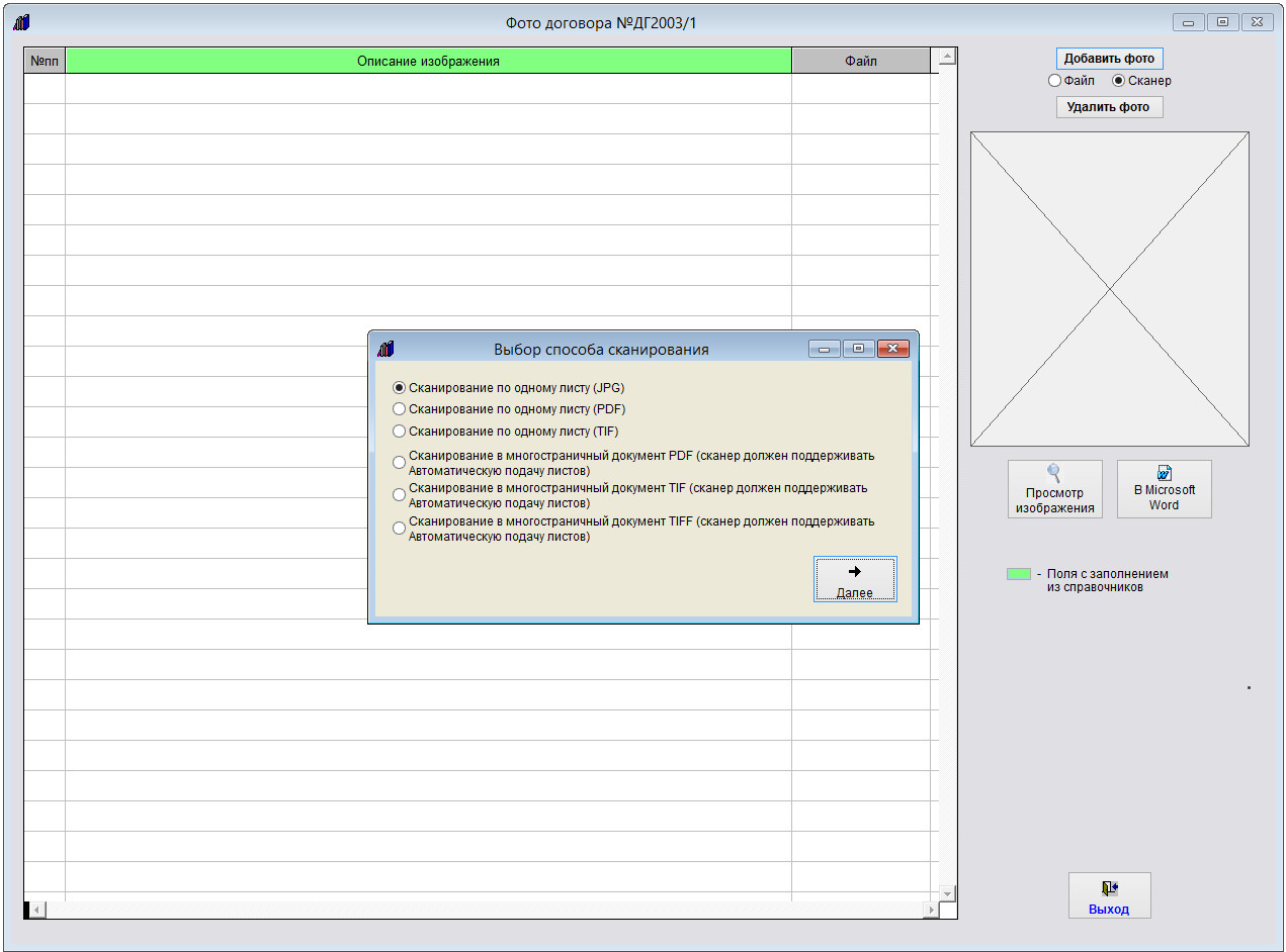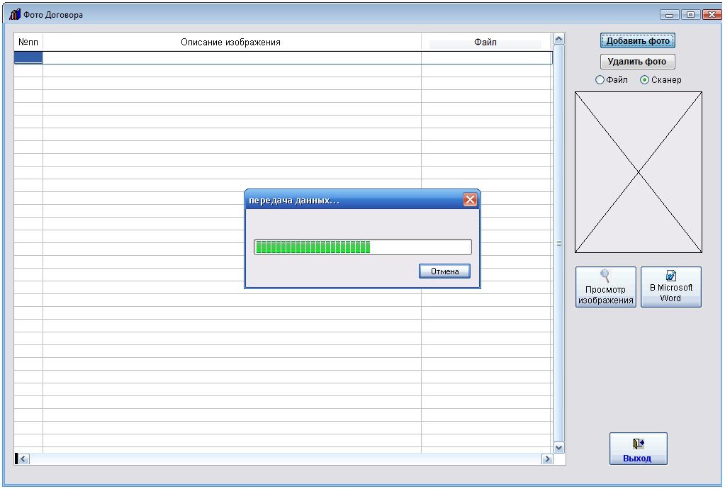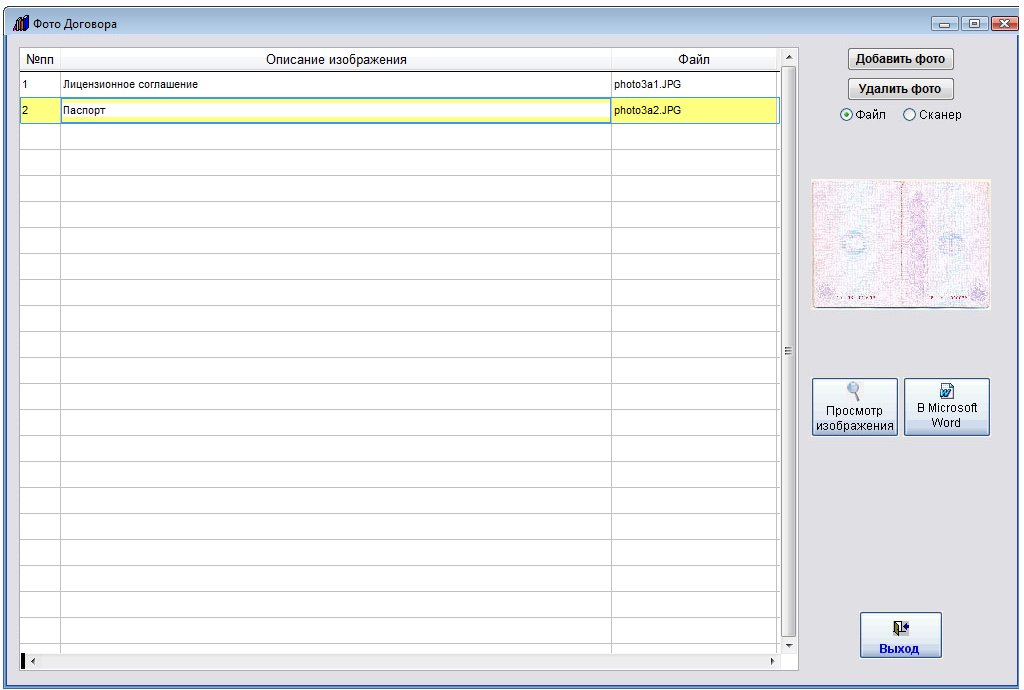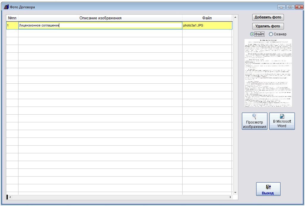 Для этого в карточке договора нажмите кнопку "Фото договора" (в группе кнопок в правой части карточки договора).