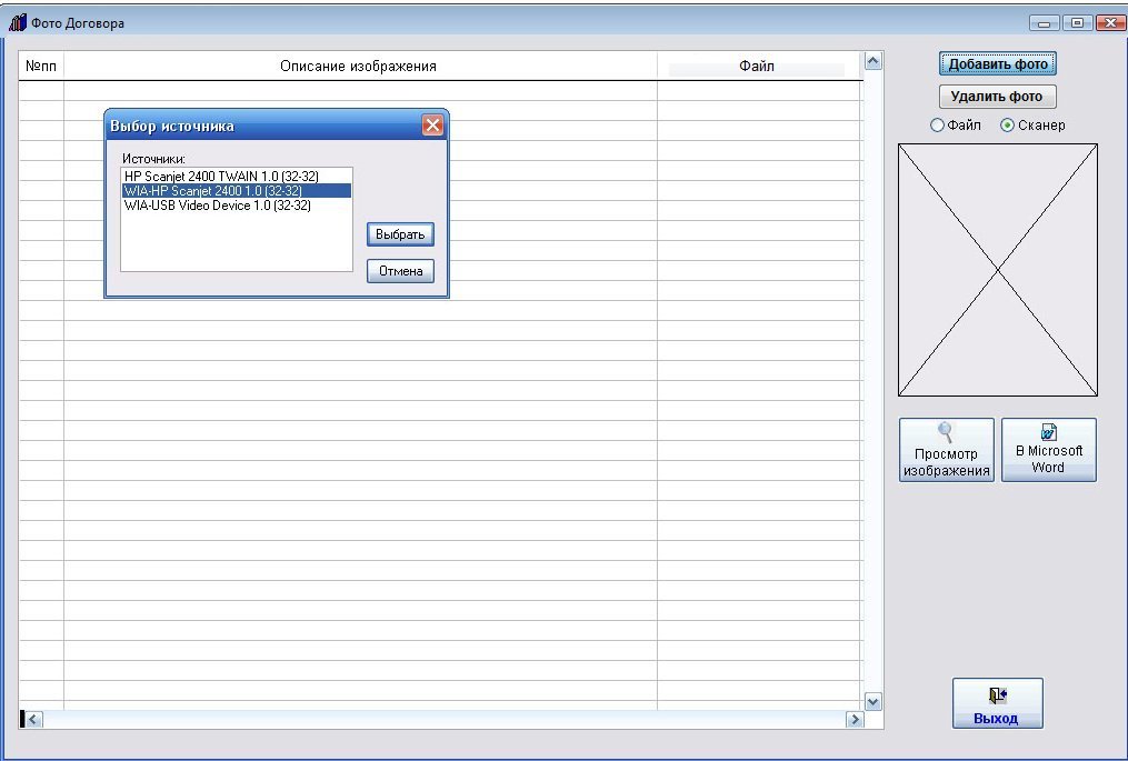Откроется окно выбора сканера. Поддерживаются TWAIN совместимые сканеры (рекомендуется использовать драйвер WIA), кроме некоторых моделей KYOCERA.