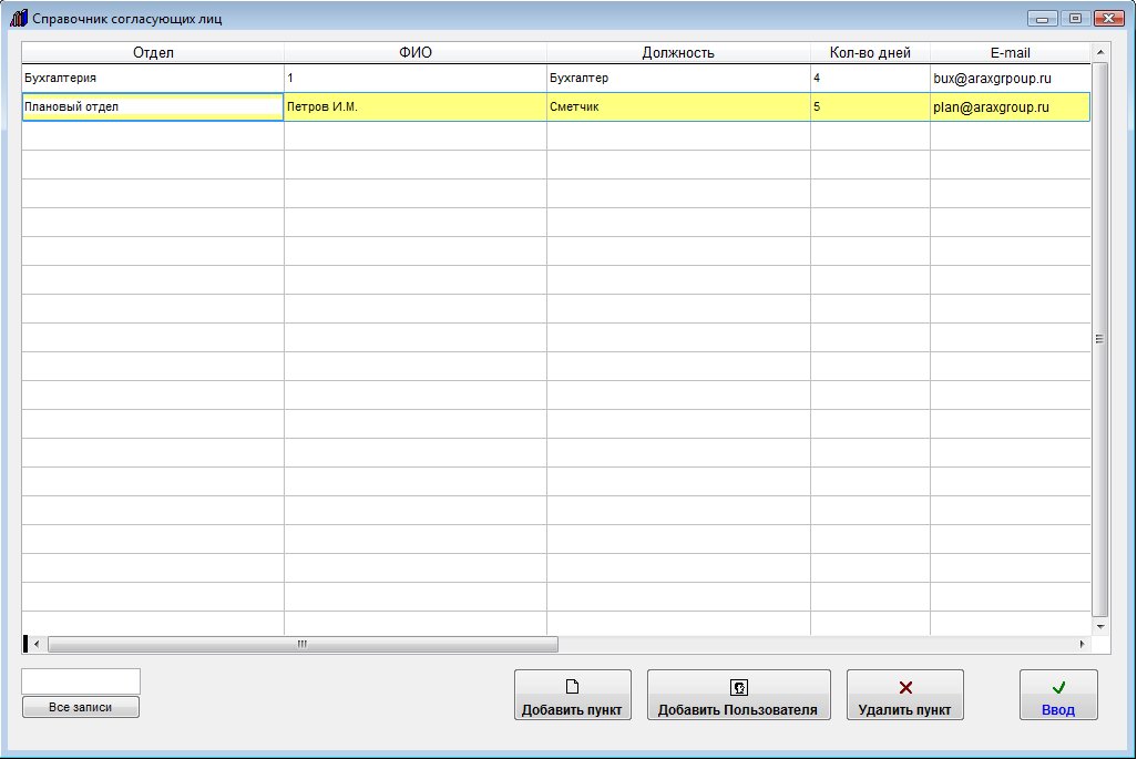 В данный справочник можно добавить как пользователей программы, так и произвольных согласующих лиц.