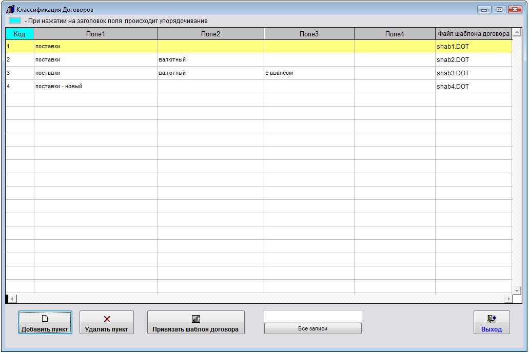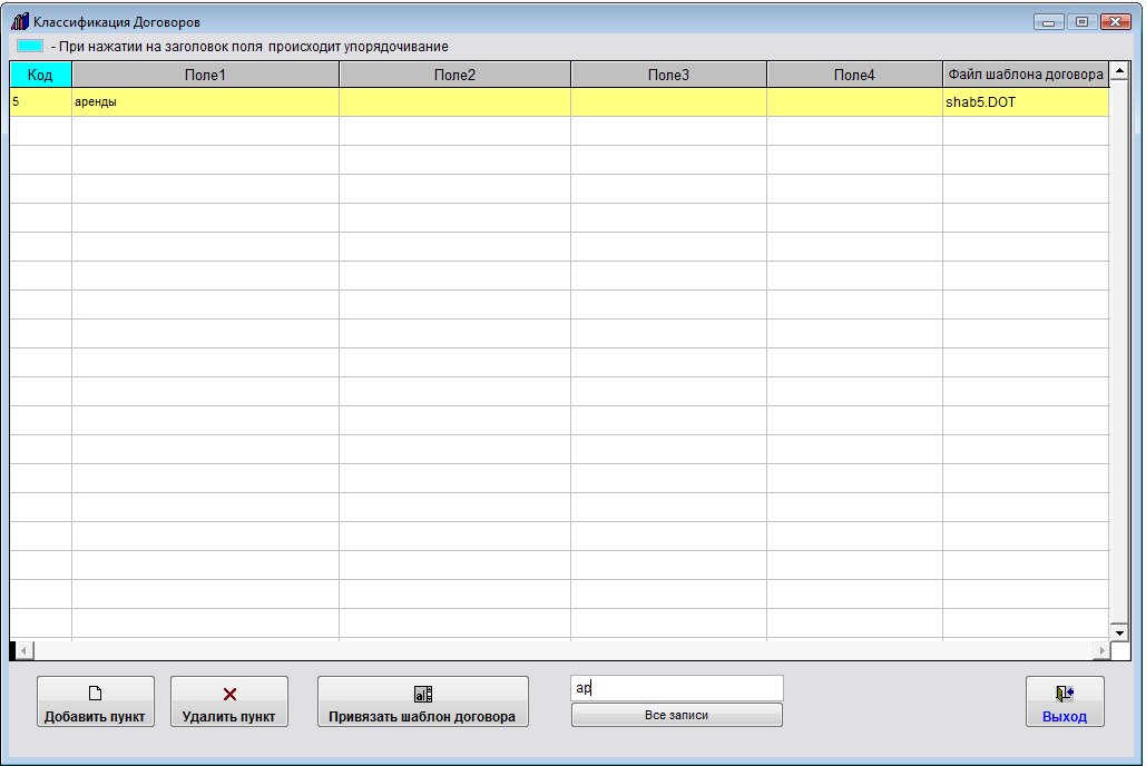 Введите в поле поиска часть классификации договора, все записи, в которых присутствует набранный в поле поиска текст, отобразятся в таблице.