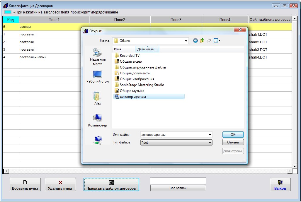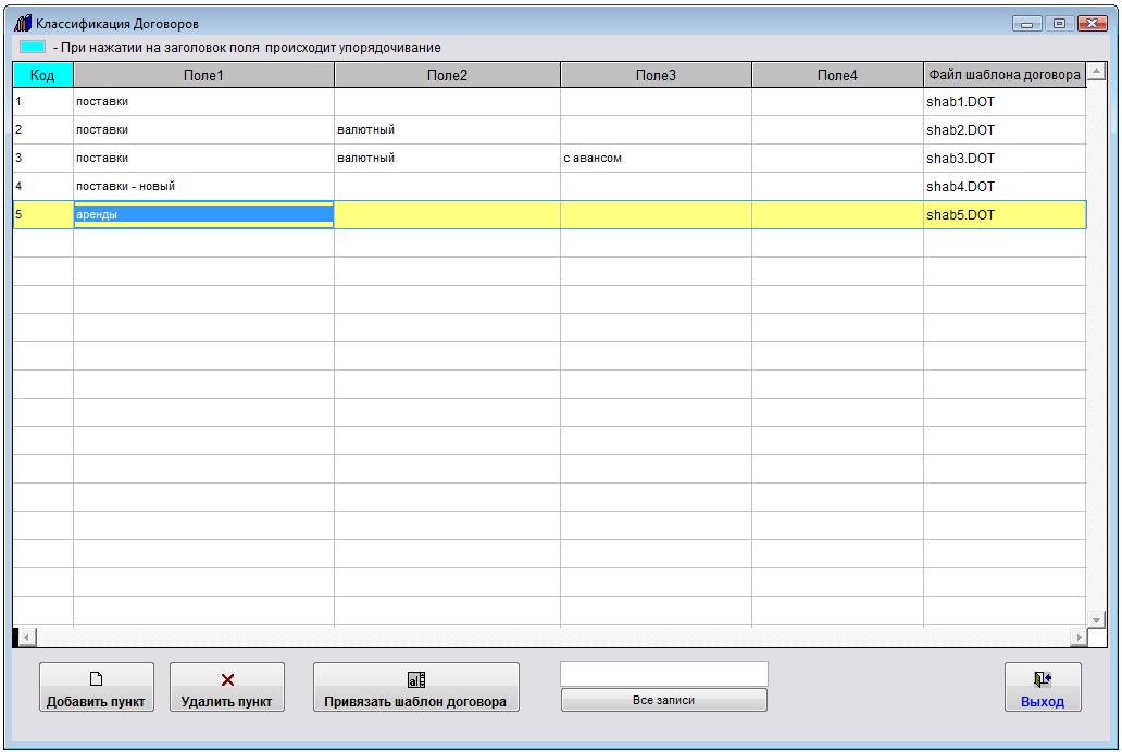 Шаблон будет привязан к добавленной ранее строке классификации договора.