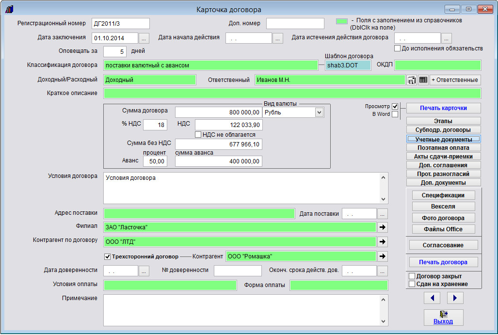 Для формирования учетных документов (счет, счет-фактура, накладная, акт) по договору нажмите кнопку "Учетные документы" (в группе кнопок в правой части формы карточки договора либо журнала договоров).