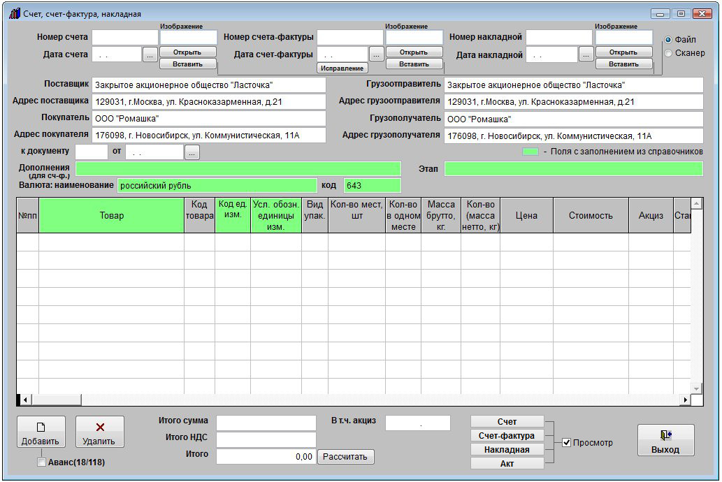 Откроется форма, в которой можно будет сформировать учетные документы (счет, счет-фактура, накладная, акт) и прикрепить отсканированные копии документов.