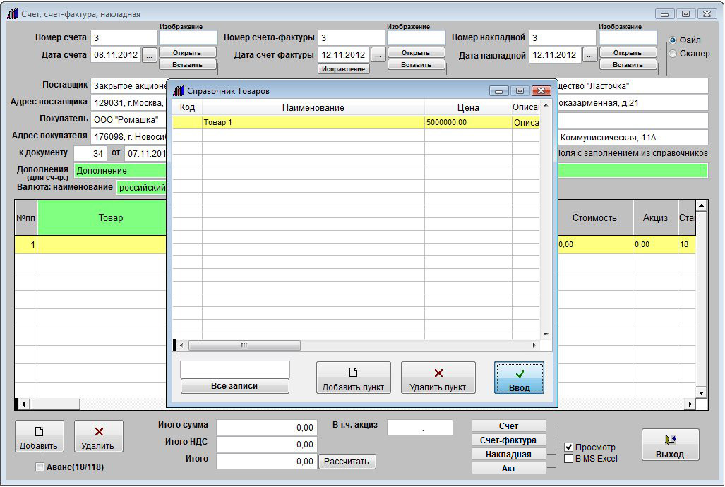 В строке отобразится название товара, стоимость, автоматически посчитается сумма налога и итоговая сумма.