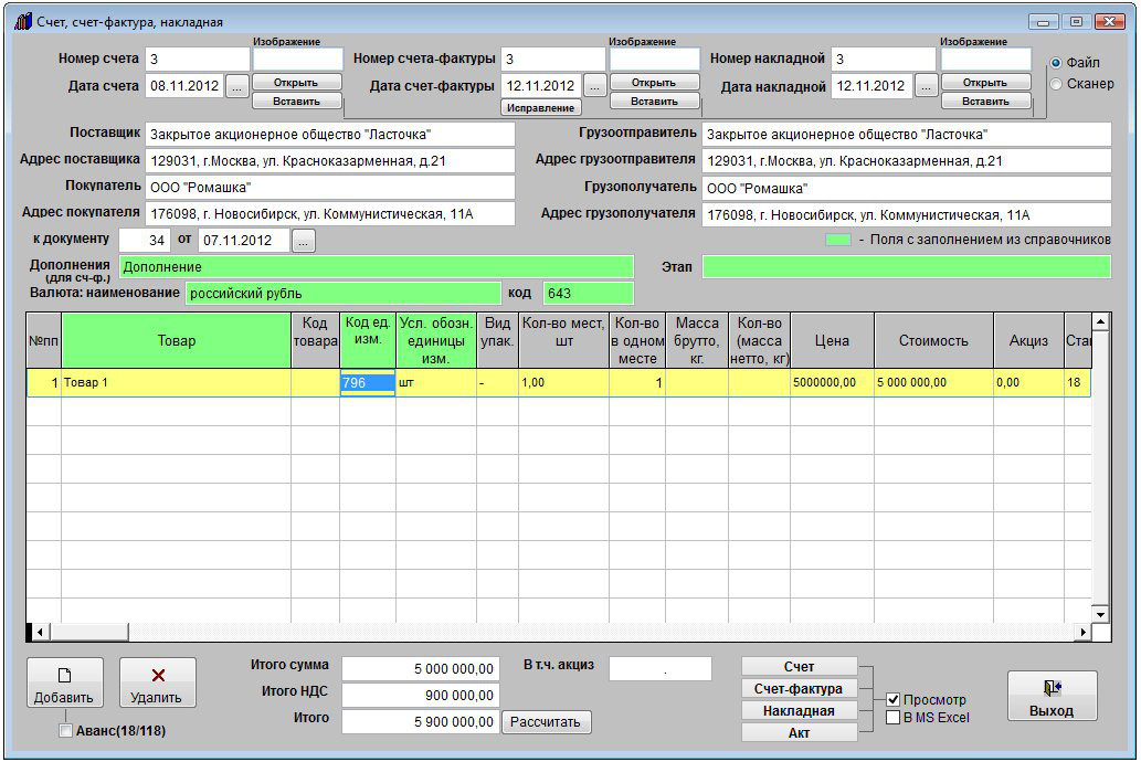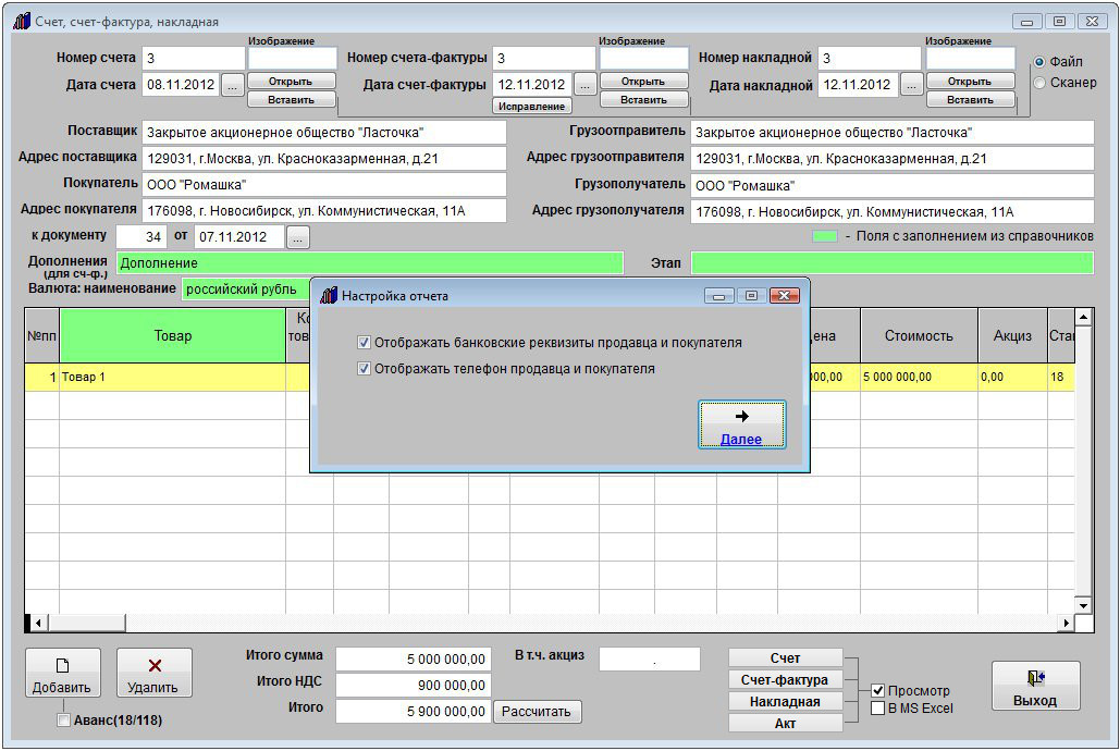 Для печати счета-фактуры нажмите кнопку "Счет-фактура".