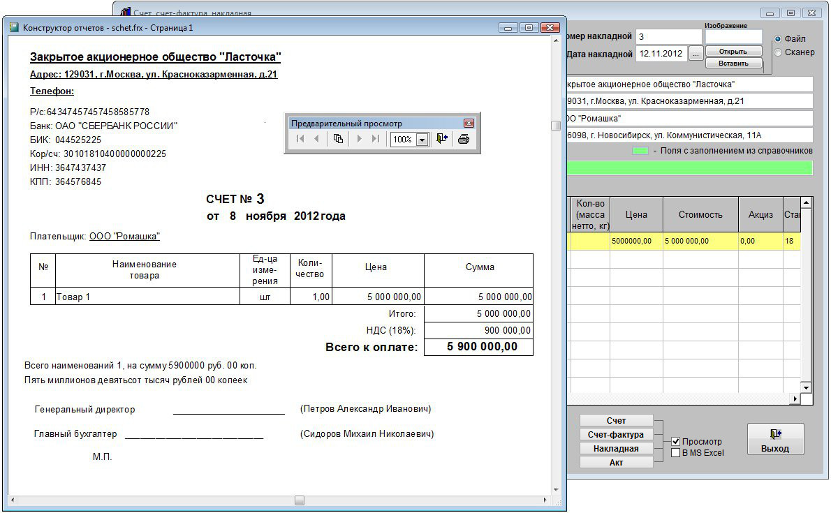 Откроется печатная форма счета-фактуры. Для вывода на принтер (по умолчанию) нажмите кнопку с изображением принтера на панели "Предварительный просмотр".